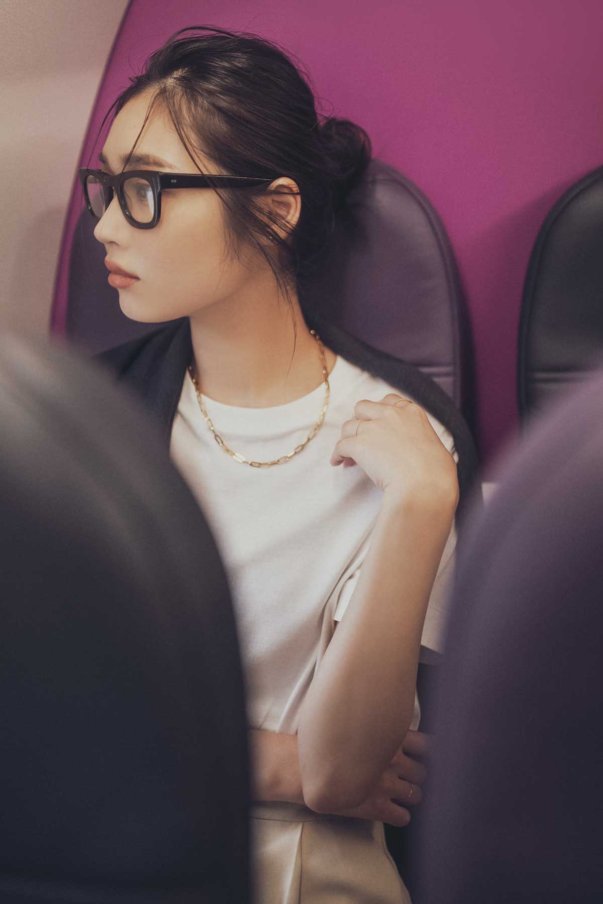 気負わず着られる白Tは機内に最適だけど、一歩間違えるとパジャマ見えの恐れも。本物志向のゴールドジュエリーで一盛りして、ただのTシャツで終わらないスタイルに。Tシャツ¥9,680(スローン)肩にかけたカーディガン¥45,100(ジョン スメドレー/リーミルズエージェンシー)プレーンリング各¥8,800スクリューリング¥13,200ダイヤリング¥35,200〈ルボンボン〉ネックレス¥286,000〈イリス47〉(すべてフーブス)めがね¥42,900(モスコット/モスコット トウキョウ)