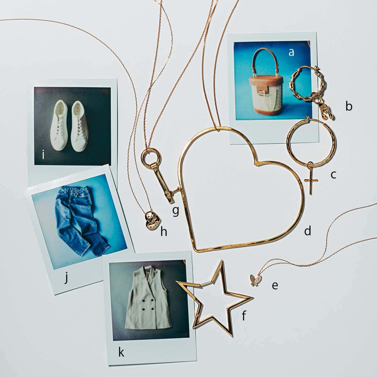 【Jewerly】チャームとピアスを自分でセレクト。b.アルファベットチャーム¥9,350ピアス¥12,100cクロスチャーム¥6,600ピアス¥18,150※すべてシングル価格(すべてマリア ブラック/マリア ブラック 表参道店)d.抜け感のあるデザインでセンスアップ。ハートネックレス¥34,100(シーミー/H.P.FRANCE)e.重ね付けが楽しくなるモチーフネックレス。バタフライネックレス〈YG×D〉¥128,700(アーカー/アーカー 表参道ヒルズ店)f.星とデニムはいつだって相思相愛。スターピアス¥28,600※シングル価格(マユ/バーニーズ ニューヨーク)g.ヴィンテージライクな佇まいも◎。キーネックレス〈YG〉¥211,200(ジジ/ホワイトオフィス)h.愛らしいぷっくりとしたフォルム。ハートネックレス〈YG〉¥82,500(ポンテヴェキオ/ポンテヴェキオ 銀座並木通り本店)
