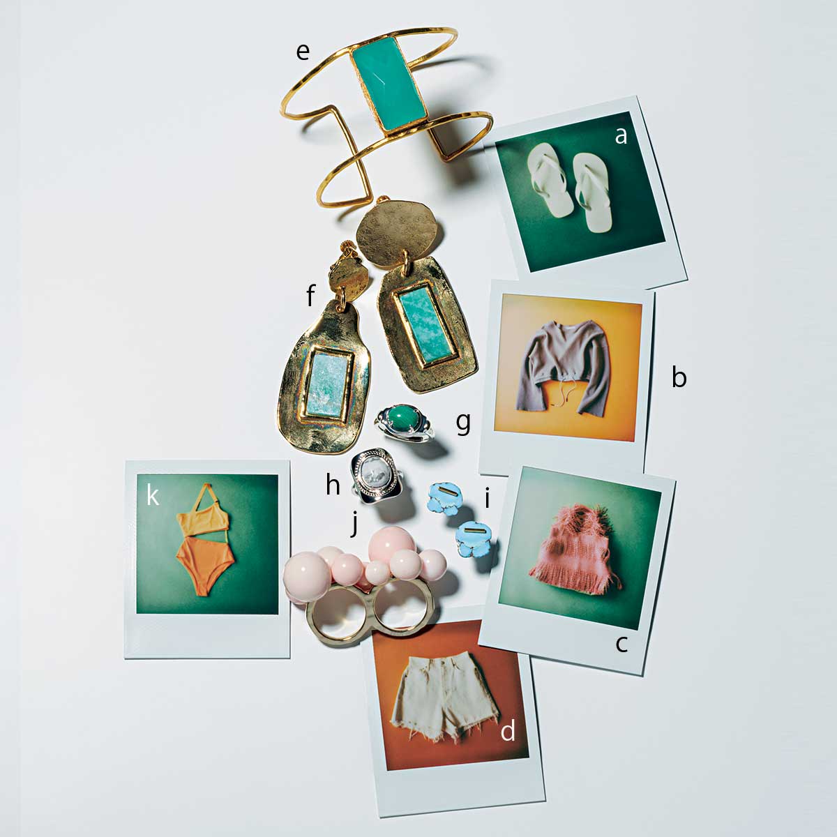e.真っ白なドレスにも、ビビッドカラーのカフタンにも。バングル〈真鍮×アクアカルセドニー〉¥19,800(マナ ローザ ジュエル/マナ ローザ)f.ビーチ→タウンの切り替えは大ぶりのピアスに任せて。イヤリング〈真鍮×アマゾナイト〉¥25,300(アデルビジュー/アデルビジュー ショールーム)g.シャープな印象。リング〈リサイクルシルバー925×マラカイト〉¥22,000(ete)h.自然の豊かさを再確認する美しいストーン。リング〈SV×ハウライト〉¥29,700(マリハ)i.有機的なフォルムが魅力。ピアス〈YG×ターコイズ〉¥132,000(トーカティブ 表参道)j思わず手元の写真を撮りたくなる、珊瑚礁のようなリング。リング〈真鍮×レジン〉¥17,600(LOVE BY e.m./e.m. 青山店)