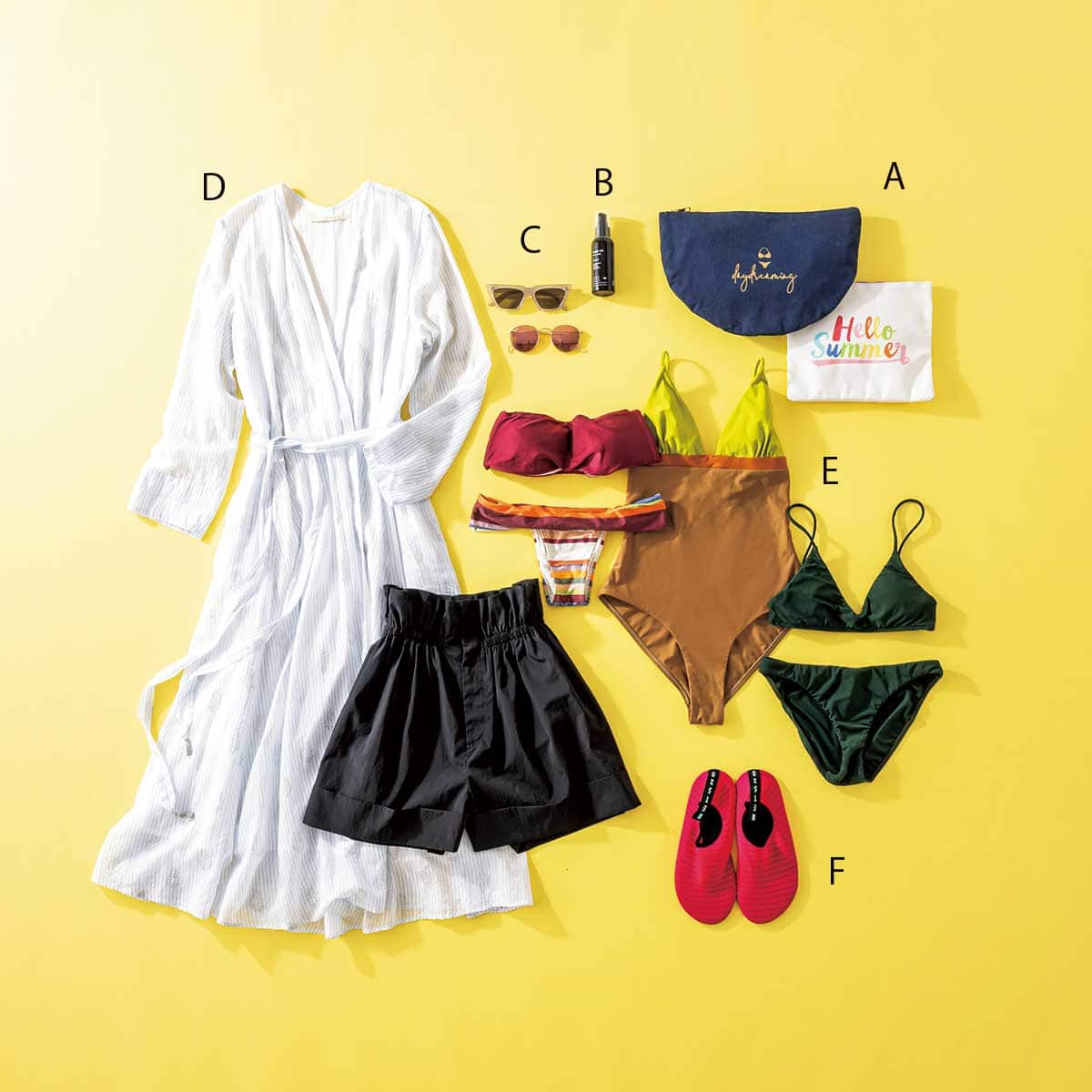 A.ポーチは2つとも内側が撥水素材になっているので、濡れた水着をそのまま仕舞えて便利!B.ヘアにも体にも使える「YAY」のオイル。旅先で簡単にヘアを整えたい時に重宝しています。C.リゾート地なら、サングラスはちょっぴり派手なデザインくらいがちょうどいい。上は「CARLA COLOUR」、下は「Ray-Ban」のもの。D.水着の上からサッと着るのに便利な「ne Quittez pas」のガウンワンピースと「nagonstans」のショートパンツ。ガウンワンピースはデニムやタンクを合わせて羽織ったらショッピングへ、ワンピースとして着てキレイめな小物を合わせたら夜のディナーへと、一着で何役もこなしてくれる優れもの。E.水着はビーチの砂の色や雰囲気、そしてシュノーケルをするか日焼けをするかなど目的によっても使い分けているので、何着も持って行きます。F.シュノーケリングでは岩場からダイブすることも多いのでマリンシューズが必須。薄手なので履いたままフィンも付けられるんです。