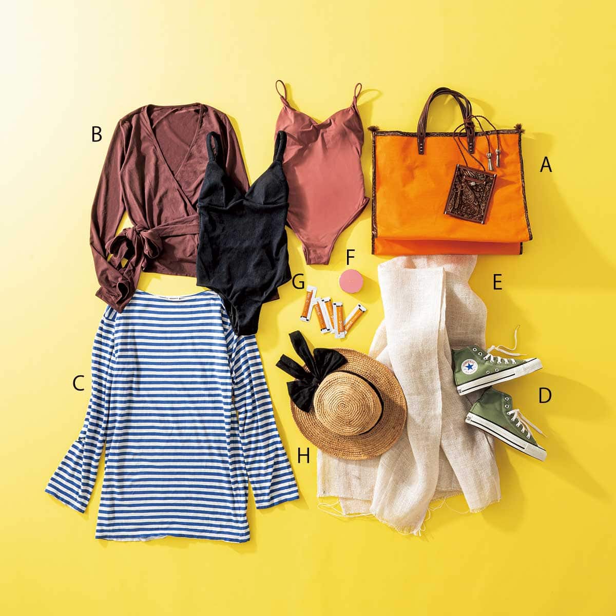 A.ビーチとホテルの行き来って意外と荷物が多いので、「A VACATION」の折り畳めるトートが大活躍。茶色のポシェットにはアクセなどバッグの中で迷子になりそうなものを。B.水着は数枚持って行き、その日の気分で使い分けています。黒は「THE NEW HOUSE」、ブラウンは「AKTE」のもの。カシュクールトップスもおしゃれに日焼け対策ができて重宝しています。C.ビーチではお尻が隠れる丈のロングTシャツが何かと便利。「67nowos」のボーダーカットソーは水着の上からサッと羽織れて、薄手でかさばらないところが最高です。D.街歩きの時はもちろん、海で遊ぶ時も安心なので、リゾート地にこそコンバースを持って行きます。E.羽織ったり、砂の上に敷いたりといろんな使い方ができる大きめの布。F.手を汚さずにパフでサッと塗れる「LILIBETH」の日焼け止め。G.リゾートではビタミンCをこまめに摂りたいので「SPIC」のLypo-Cが必須。H.太陽の下は大好きですが、日焼けはしたくないので「SCALA」のハットを。