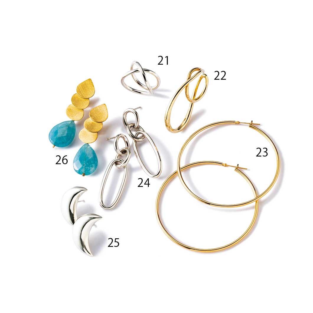 21.存在感ある地金シルバーリング。¥11,500、22.ゴールドのイヤカフ。¥16,500(ともにココシュニック オンキッチュ/ココシュニック)23.写真映りを計算した大きめフープも。¥59,400(モニス/フォーティーンショールーム)24.万能なシルバーピアスも必需品。¥20,020〈バルブス〉、25.月形のフォルムがクールなイメージ。¥12,430〈パズ・コレクティブ〉(ともにZUTTOHOLIC)26.オリエンタルなストーンピアスも旅に持っていきたい!¥7,700(エネーダフランカ/ココシュニック新宿高島屋店)