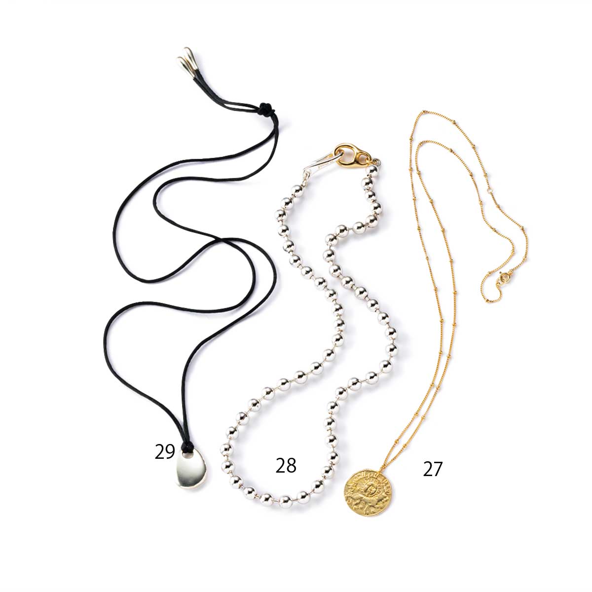 27.ヴィンテージライクなこなれ感があるコインネックレス。¥25,300(マリハ)28.シルバーのボールネックレスは、コーディネートが物足りないときの救世主!¥9,900(イン ムード/フォーティーン ショールーム)29.旅ムード高まるカジュアルなコードネックレスも。¥33,000(リューク)