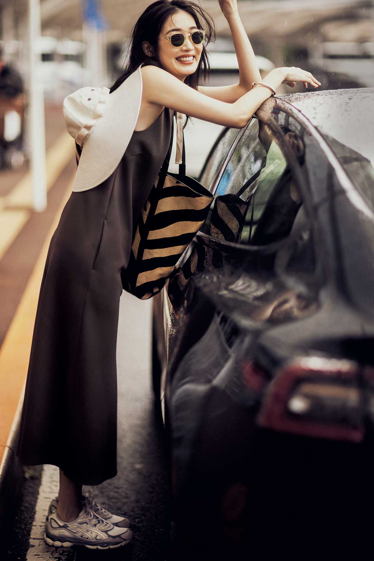 ローカルなスポットでも、ちょっと背伸びしたごはん屋さんでも対応するキレイめワンピ。締め付け感がないから、車移動中も食事中もノンストレス。長時間のドライブでもシワにならない素材を選ぶのもポイント。小物で視線を上に集めれば、足元がスニーカーでもバランス良好。ワンピース¥12,700(ミラオーウェン/Mila Owen ルミネ新宿2店)ハット¥24,200(イリス 47/フーブス)バッグ¥40,000バングル¥9,990(ともにバナナ・リパブリック)スニーカー¥15,400(アシックス/アシックスジャパン株式会社 お客様相談室)サングラス¥46,200(モスコット/モスコット トウキョウ)