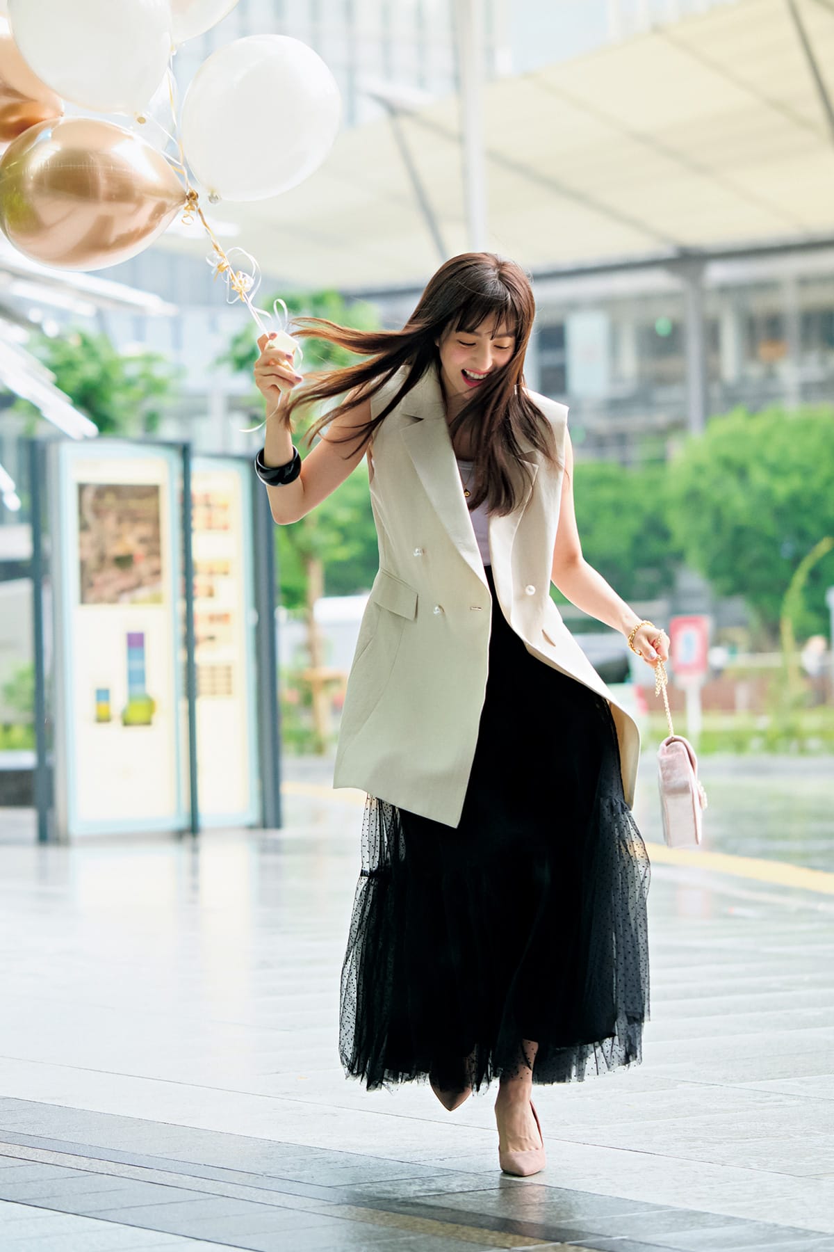 はやる気持ちは軽やかなブラックのチュールスカートにのせて。メンズライクなジレと合わせると甘さ控えめにひと役。ジレ¥23,100スカート¥22,000(ともにアルページュストーリー/アルページュストーリープレスルーム)タンクトップ¥9,350(エイチ ビューティ&ユース)バッグ¥193,600(ロジェ ヴィヴィエ/ロジェ・ヴィヴィエ・ジャパン)パンプス¥34,100(ピッピシック/ベイジュ)ネックレス¥9,900ブレスレット¥8,800(ともにインムード/フォーティーン ショールーム)バングル¥2,100(アビステ)