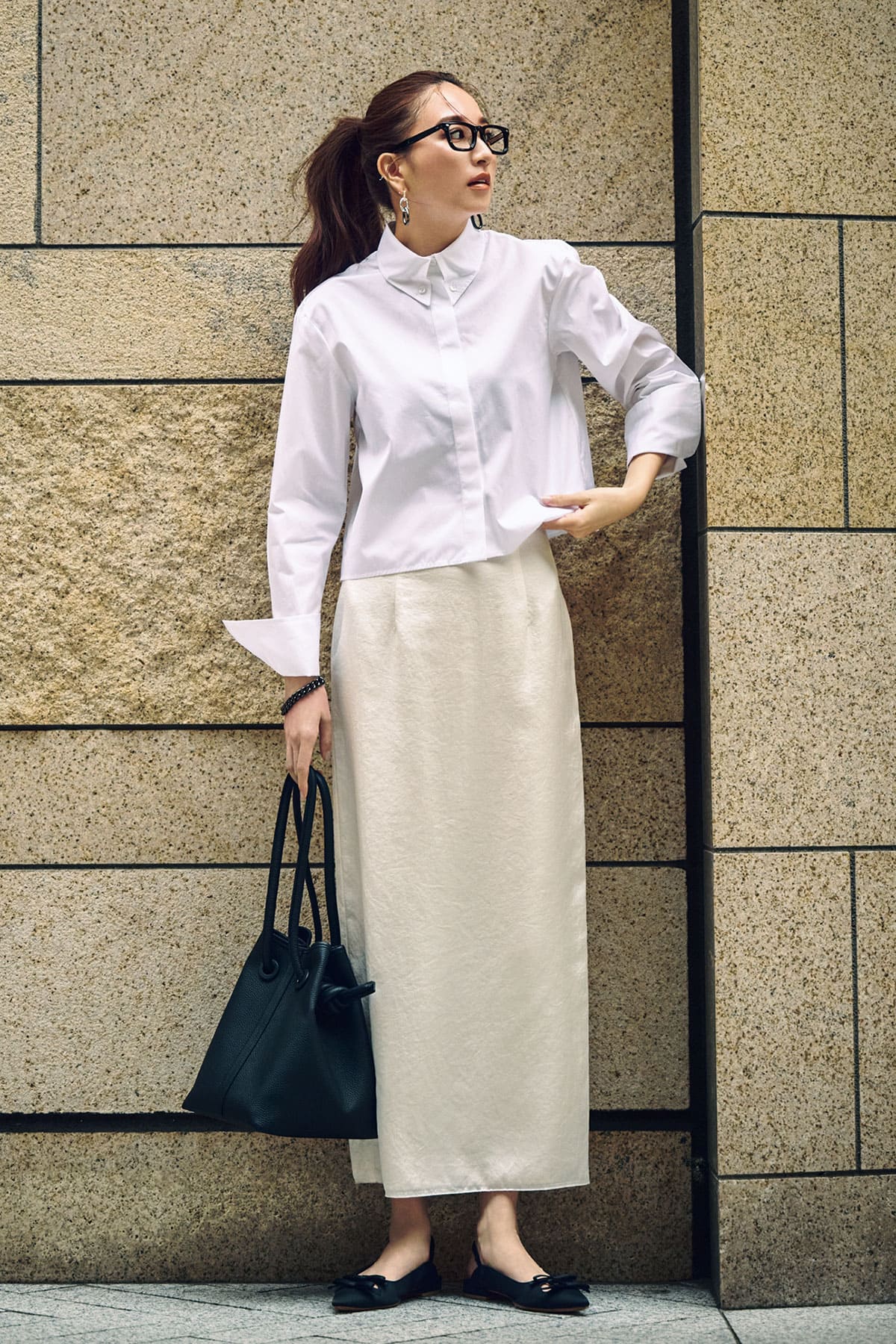 サテンのIラインスカートに端正な白シャツがマッチ。スカート¥19,800(セテンス)シャツ¥45,100(EVA MANN/THIRD MAGAZINE)バッグ¥51,700(ヴァジック/ヴァジックジャパン)シューズ¥26,400(ツル バイ マリコ オイカワ)メガネ¥38,500(アイヴァン/アイヴァン 東京ギャラリー)ピアス¥8,800ブレスレット¥24,200(ともにワンエーアールバイウノアエレ/ウノアエレ ジャパン)