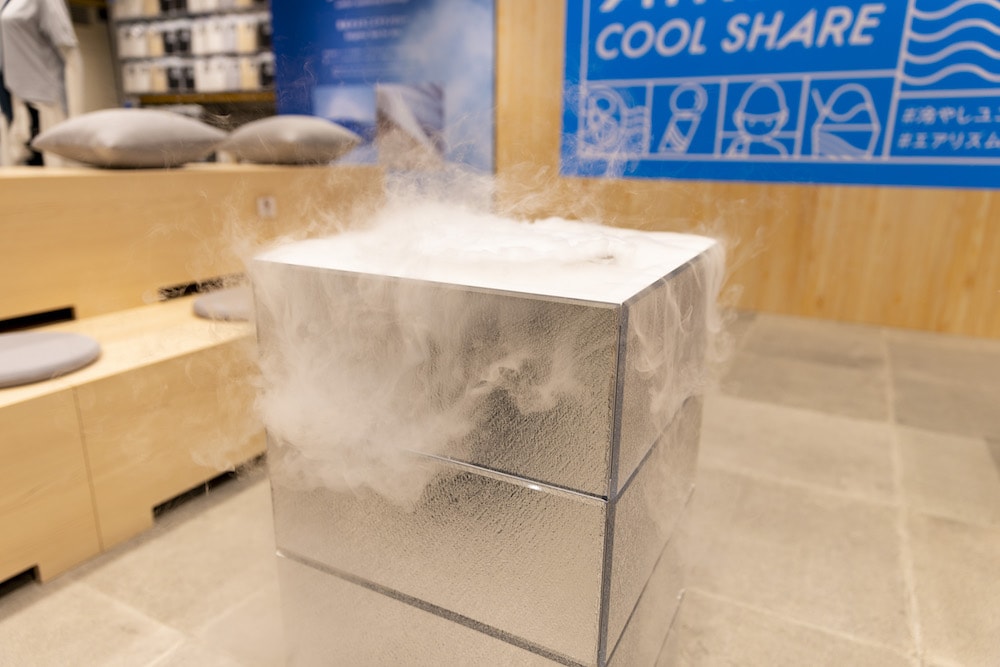 地下1階の売り場 Special Room では「冷やしサウナ」が登場。サウナ風のベンチで一息つきながら、エアリズムの接触冷感を楽しめるクッションや、ドライアイスの冷風を仰ぐ冷波師によるロウリュタイムによって涼を感じることができます。