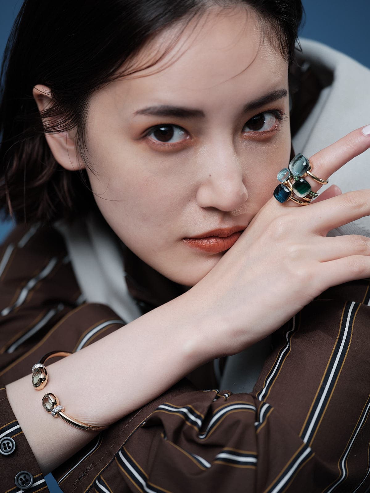 色石ジュエリーの最高峰「ポメラート」のリングを重ねて、指先に高揚感を