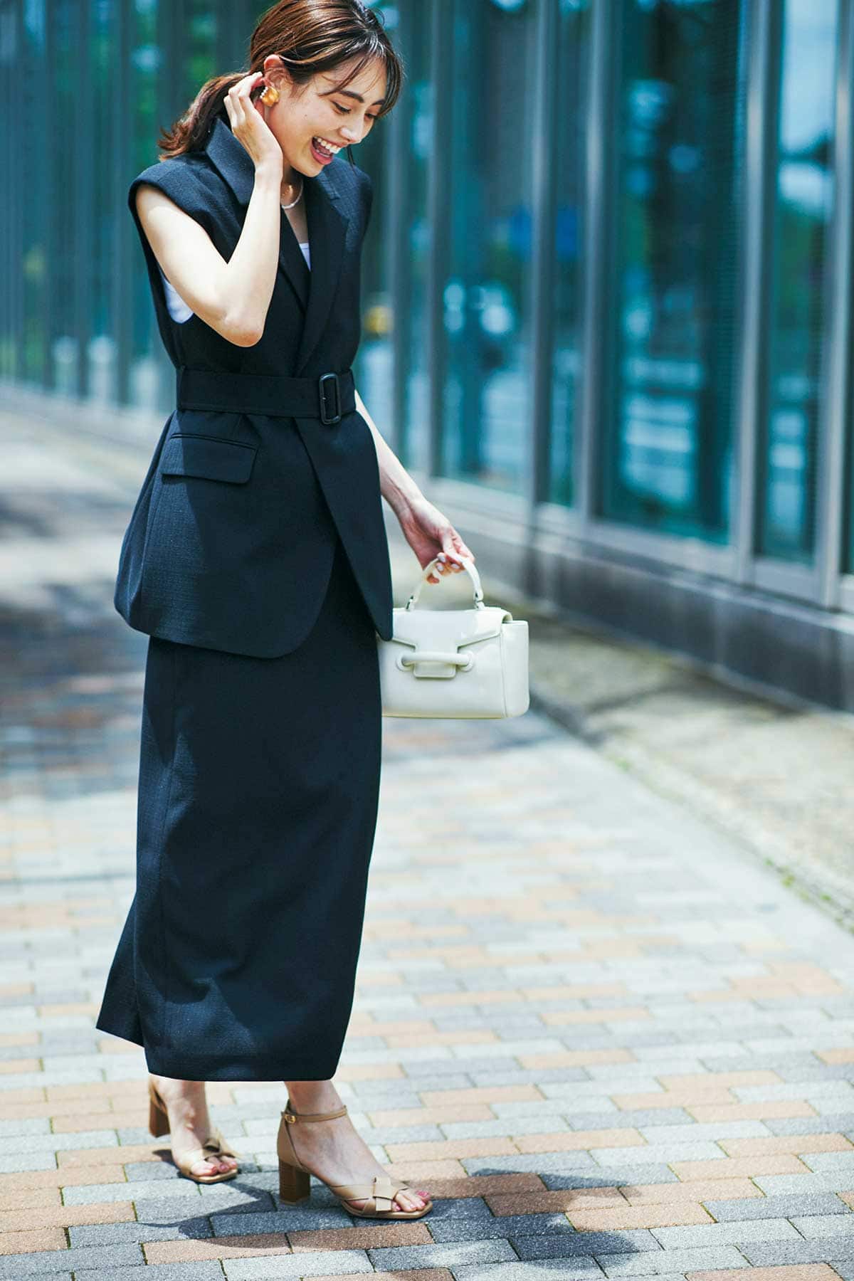 ジレ+タイトスカートの今時セットアップできちんと感と女っぽさを両立