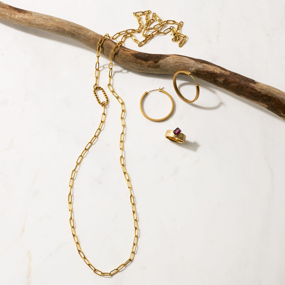 最近は光沢感があるものより、マットな質感のレトロなイメージが流行りです。[上から]アクセントについた「O」のパーツがさりげなく華やか。ネックレス〈316L〉¥10,450シンプルなデザインの二つ目を買うなら、マット加工がおすすめ。ピアス〈316L〉¥7,480マットな質感が仕草を高見えさせてくれます。リング〈SV925/ニッケルフリー×グレープガーネット〉¥44,000(すべてLARICA)
