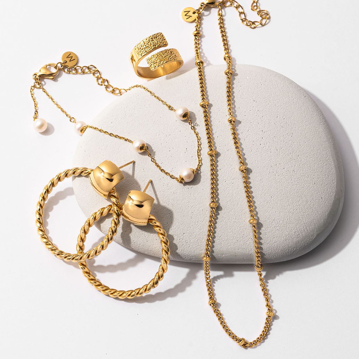 [左上から時計回りに]小さなパールが手首を華奢に見せてくれます。ブレスレット〈316L×18kコーティング〉¥5,299ヴィンテージ感のあるマット加工がオシャレ。リング〈316L×18kコーティング〉¥5,299涼しげな首元が開いた服に合わせても。チョーカー〈316L×18kコーティング〉¥4,299顔周りを華やかにする大ぶりさで、アップヘアに合わせたい。ピアス〈316L×18kコーティング〉¥5,299(すべてMarc Mirren/ジャニス)