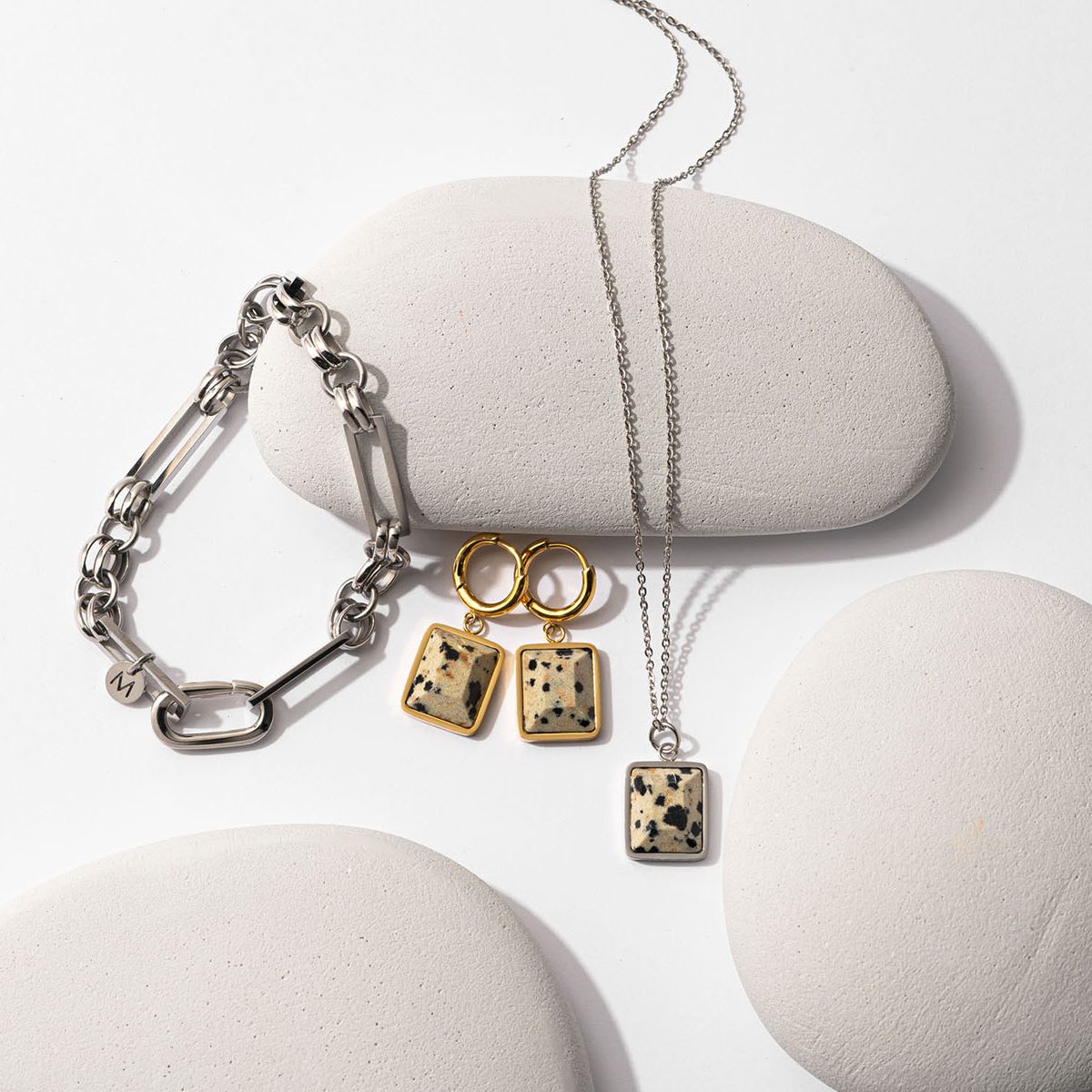 クールなテイストが好きな人におすすめのスクエアアイテム。[左]ノースリーブを着たときのアクセントとして手元はメンズライクに。ブレスレット〈316L〉¥5,299[中]ダルメシアン柄のストーンは真っ黒や真っ白な服のアクセントにちょうどいい。ピアス〈316L×18kコーティング×ダルメシアンジャスパー〉¥7,499[右]ピアスと同シリーズ。チャーム〈316L×ダルメシアンジャスパー〉¥4,899ネックレスチェーン〈316L〉¥3,199(すべてMarc Mirren/ジャニス)