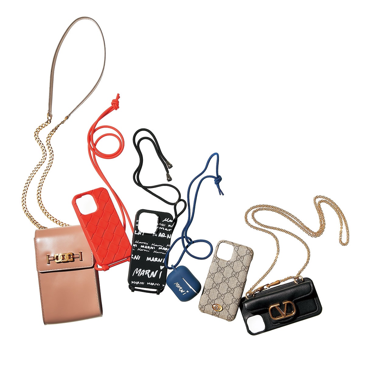 [右から]黒×ゴールドロゴの辛口な佇まいにチェーンストラップで、ミニバッグみたいな存在感を放って。「Vロゴ シグネチャー」〈H15×W7.1×D0.8㎝〉¥141,900(ヴァレンティノ ガラヴァーニ/ヴァレンティノ インフォメーションデスク)上品なベージュトーンにGGパターンが上品なムード「。オフィディア」iPhone14ケース〈H15×W7×D1㎝〉¥46,200(グッチ/グッチ ジャパン)遊び心あふれる手書き風ロゴが可愛い!AirPodsケースとお揃いで持ちたい。iPhone14カバー〈H15×W7.5×D1㎝〉¥26,400、AirPodsケース〈H5×W6.5×D2㎝〉¥16,500(ともにマルニ/マルニ ジャパン クライアントサービス)イントレチャートをラバーシリコンで表現した、大人気のiPhoneケース。取り外し可能なストラップ付き。鮮やかオレンジは夏のカラーレスコーデとも相性抜群!iPhone13Pro ケース〈H15×W7.5×D1.2㎝〉(ボッテガ・ヴェネタ/ボッテガ・ヴェネタ ジャパン)半光沢レザーが大人な、ポシェット感覚で使えるフォンケース。背面にはカードスロットも。「ケイト モバイルフォンケース」〈H18.5×W11×D4㎝〉¥116,600(トッズ/トッズ・ジャパン)