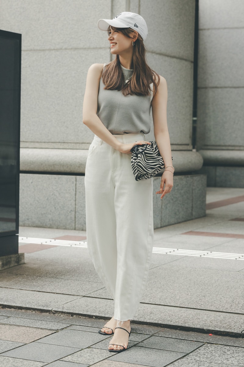 パンツ¥17,600(カデュネ/カデュネ プレスルーム)タンクトップ¥11,000(Mila Owen/Mila Owen ルミネ新宿2店)バッグ¥26,400(オウレンティ/ル タロン プリュ 有楽町マルイ店)靴¥15,950(AKTE)帽子¥4,400(ニューエラ)ピアス¥21,010(パズ・コレクティブ/ZUTTOHOLIC)ネックレス¥25,300(マリハ)バングル¥14,400(チビ・ジュエルズ/チビ・ジュエルズ・ジャパン)ブレスレット¥14,850(エナソルーナ)リング¥18,700(オンブル ビジュー/フォーティーン ショールーム)