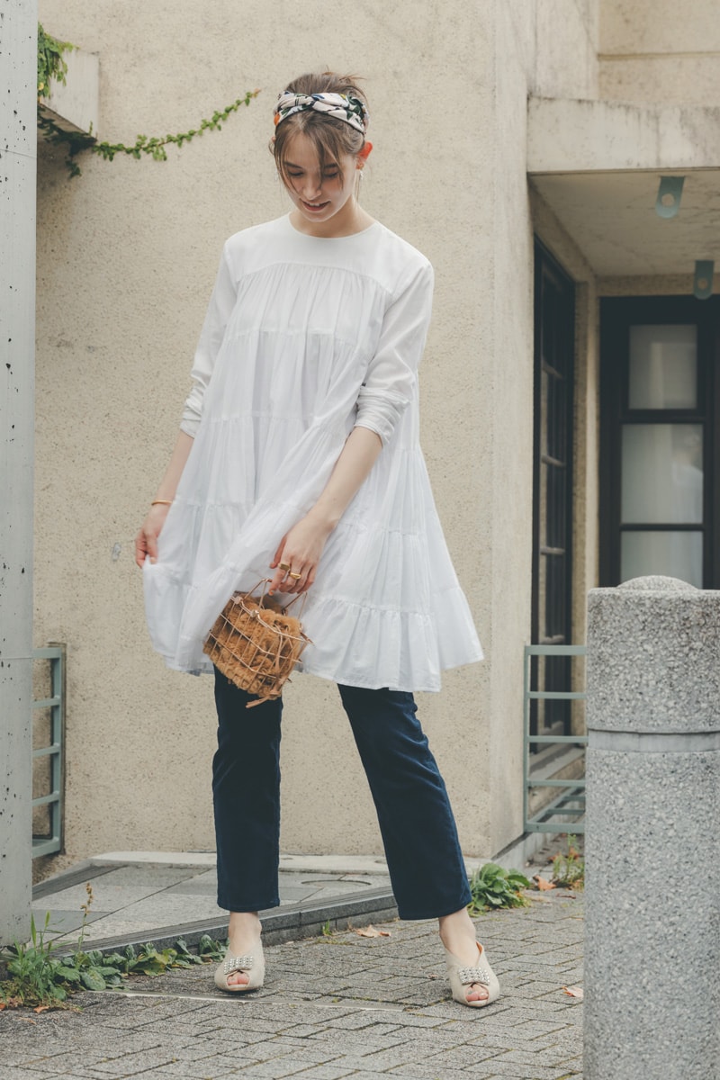 チュニック¥61,600〈マーレット〉パンツ[日本別注]¥36,300〈マザー〉(ともにサザビーリーグ)バッグ¥74,800(ザンケッティ/マルティニーク ルミネ横浜)靴¥39,600(PIPPICHIC)スカーフ¥15,400(マニプリ)ピアス¥11,600(ジェンマ アルス/GEMMA ALUS)バングル¥14,520(チビ・ジュエルズ/チビ・ジュエルズ・ジャパン)リング2本セット¥21,230(ソコ/ZUTTOHOLIC)