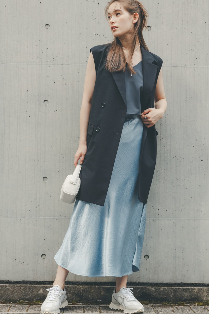 肩出し、肌見せがキーワードとなる今年の夏。キャミトップスを着たいけれどどうしても抵抗がある人も多いですよね。そんな時にあると便利なのが、ロングジレ。気になる肩まわりをこれひとつでカバーできるうえに、着こなしに大人っぽいエッセンスもプラスしてくれる万能アウター! 自分の肩幅ちょうどもしくは少し大きめなものを選ぶと肩や腕をさりげなく細く見せてくれます。夏だけでなくほぼオールシーズンで使えるので、一枚持っておいて損はなし!