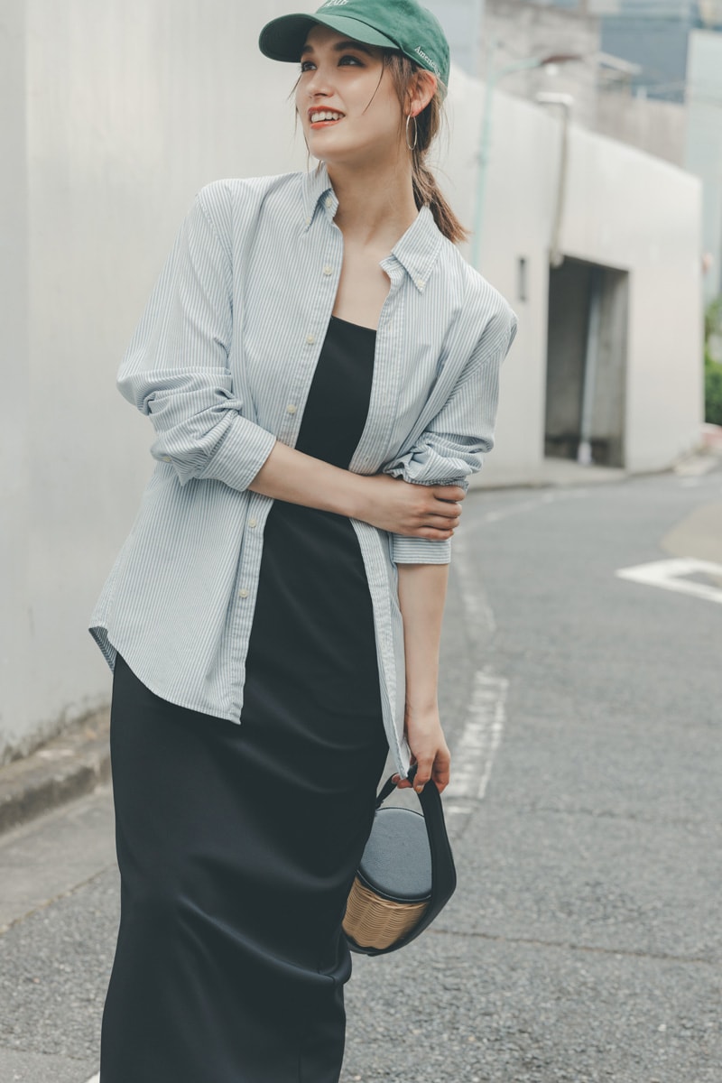 全身をとにかくフルカバーしたい! と思うならIシルエットのキャミワンピにビッグシルエットのシャツを羽織って。きれいめなワンピはキャップとシャツでカジュアルダウンしてこなれ感を演出。グッと締まって見えるブラックワンピでより着痩せを狙うなら、縦ラインを強調するシャツを羽織るのがおすすめ。足元はサンダルや靴下でハズすのもかわいい!