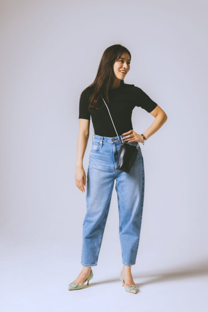 「テーパードのボトムスはどんなスタイルの人にも合いますし、スタイルもよく見えるので、つい合わせがち。けれど、トップスもボトムスも定番アイテムを合わせてしまうと、無難で見慣れたスタイルになってしまいます。リブトップスは、体にフィットしコンパクトに見えるトップスなので、ボトムスにはボリュームをもたせるのが好バランス。今年だったら、カーブシルエットのボトムスを合わせると、きれいめとカジュアル、2つの要素が入り今年らしいムードに仕上がります。(スタイリスト・児嶋さん)」