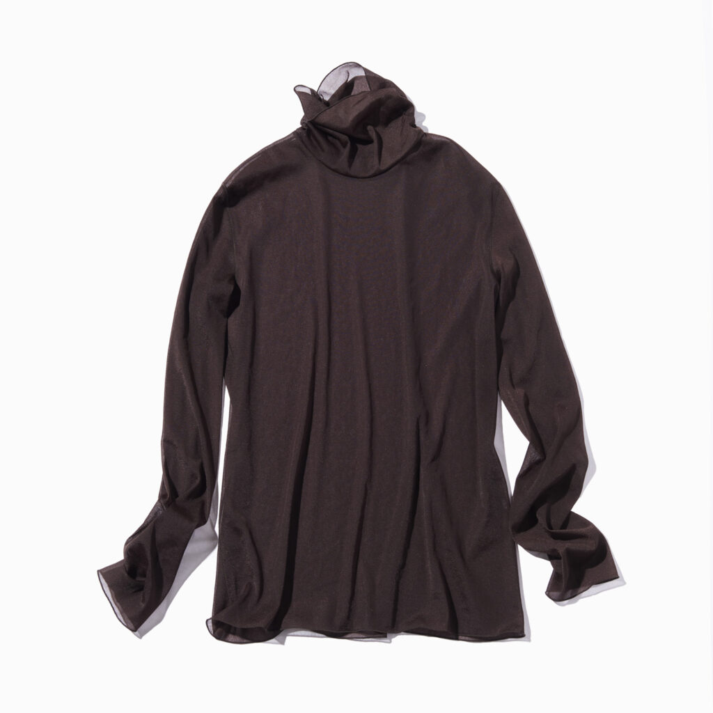 わかりやすい肌見せではなく、透けることでさりげなく肌感を演出するシアートップス。モードなアイテムながら、着こなし次第でセクシーにもヘルシーにも転ぶため、初心者には難しいアイテムです。カットソー¥5,990(PLST)