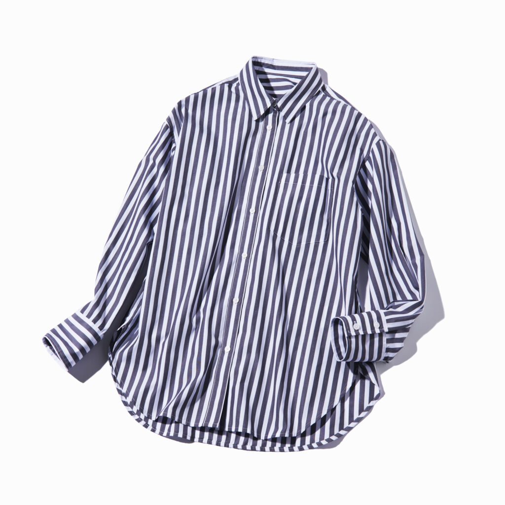 体が中で泳ぐぐらいのオーバーサイズシャツは、夏は羽織りとしても使えて体型カバーも叶う万能アイテム。無地よりも、ストライプやギンガムチェックなど、柄があるアイテムが、コーディネートのアクセントになって着回せます。シャツ¥1,990(GU)