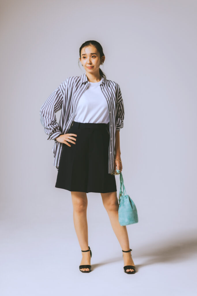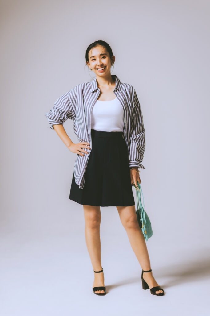「オーバーサイズシャツはメンズライクなアイテムなので、さりげなく女らしい要素を足すのが正解。デコルテをほどよく肌見せすれば、女っぽさとともに、デコルテに抜け感が出て小顔効果も期待できます。ただ、肌見せはさりげなさが大事。谷間が見えるほど空きの深いタンクトップはいやらしく見えてしまうので注意して」(スタイリスト・児嶋里美さん)