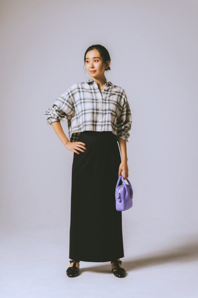「短丈シャツは、デザインそのものが最旬なのでラフに着崩さず、ボタンを上まで留めてきちんと着こなすのがおすすめ。ボトムスは、肌が見えないハイウエストのものを選んであくまでもグッドガールな雰囲気で着こなすと、アラサー世代になじむスタイリングになります」(スタイリスト・児嶋里美さん)