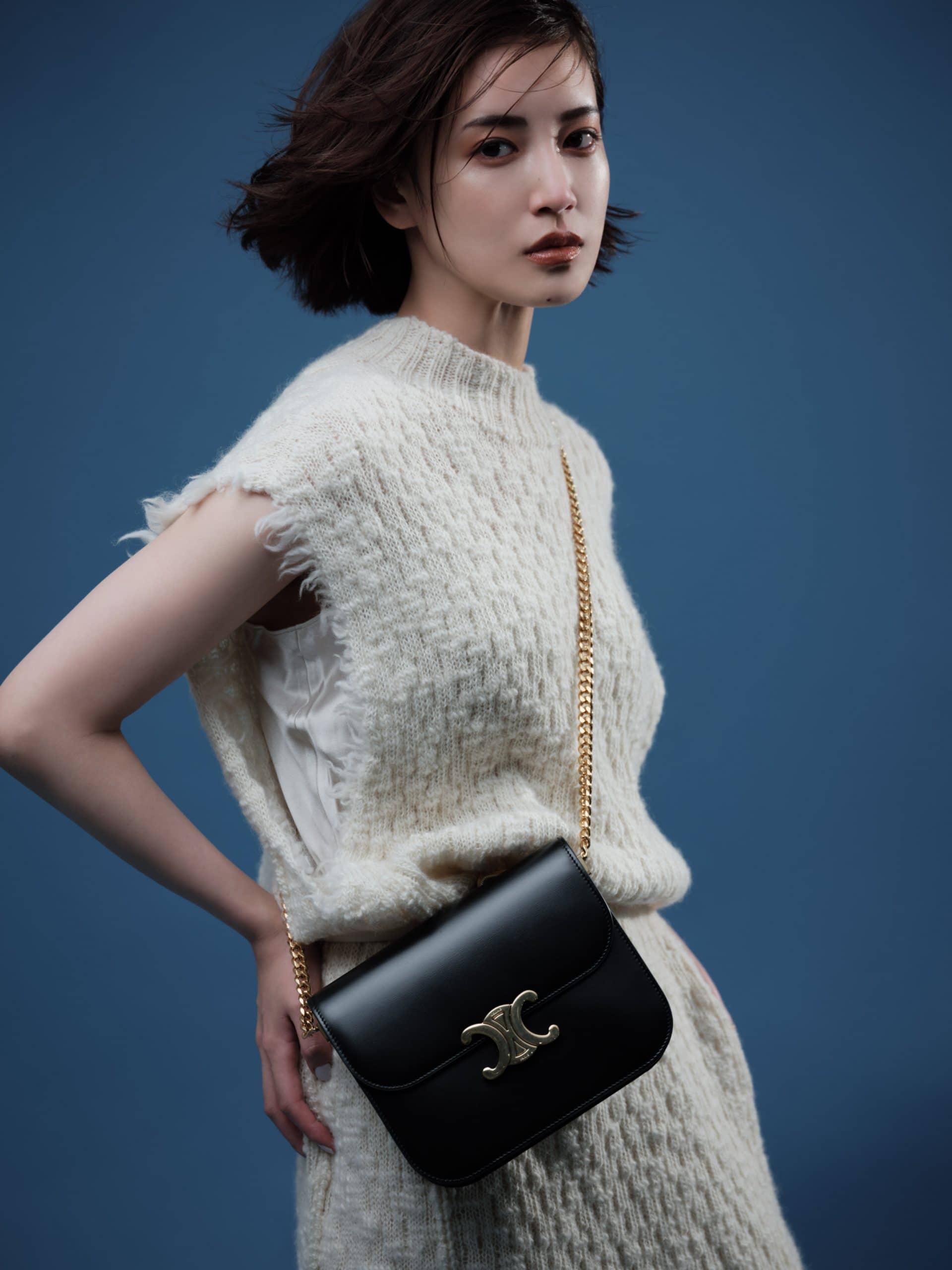 「トリオンフ」のエンブレムは、1972年、メゾンの創業者であるセリーヌ・ヴィピアナの車が凱旋門のあるエトワール広場で故障した際に目にした、凱旋門を囲む鎖から着想を得て誕生。メゾンのアイコンが煌めくクリーンでミニマルなバッグは、フォーマルからカジュアルまで幅広いお呼ばれシーンにマッチ。