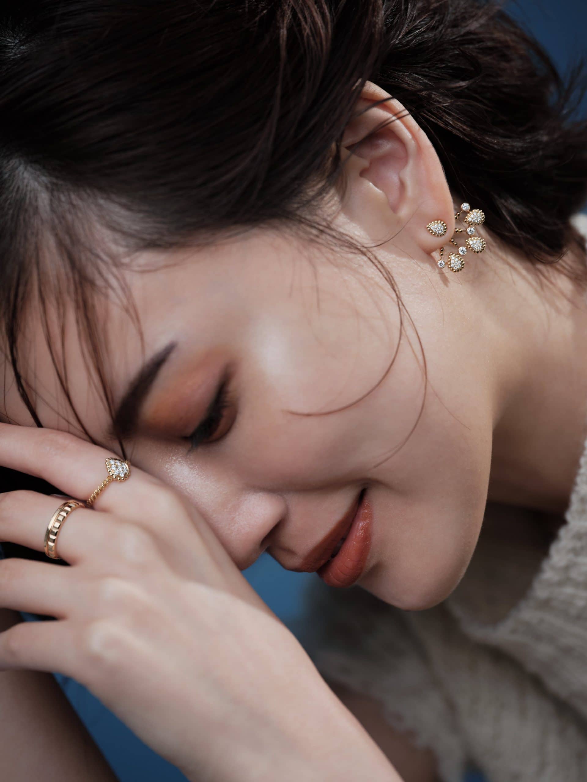 ピアス「セルパンボエム」〈YG×D〉¥627,000人差し指リング「セルパンボエム」〈YG×D〉¥418,000中指リング「キャトル ラディアント」〈PG〉¥323,400(すべてブシュロン/ブシュロン クライアントサービス)ワンピース¥36,300(ウーア/ビューティ&ユース ユナイテッドアローズ みなとみらい店)