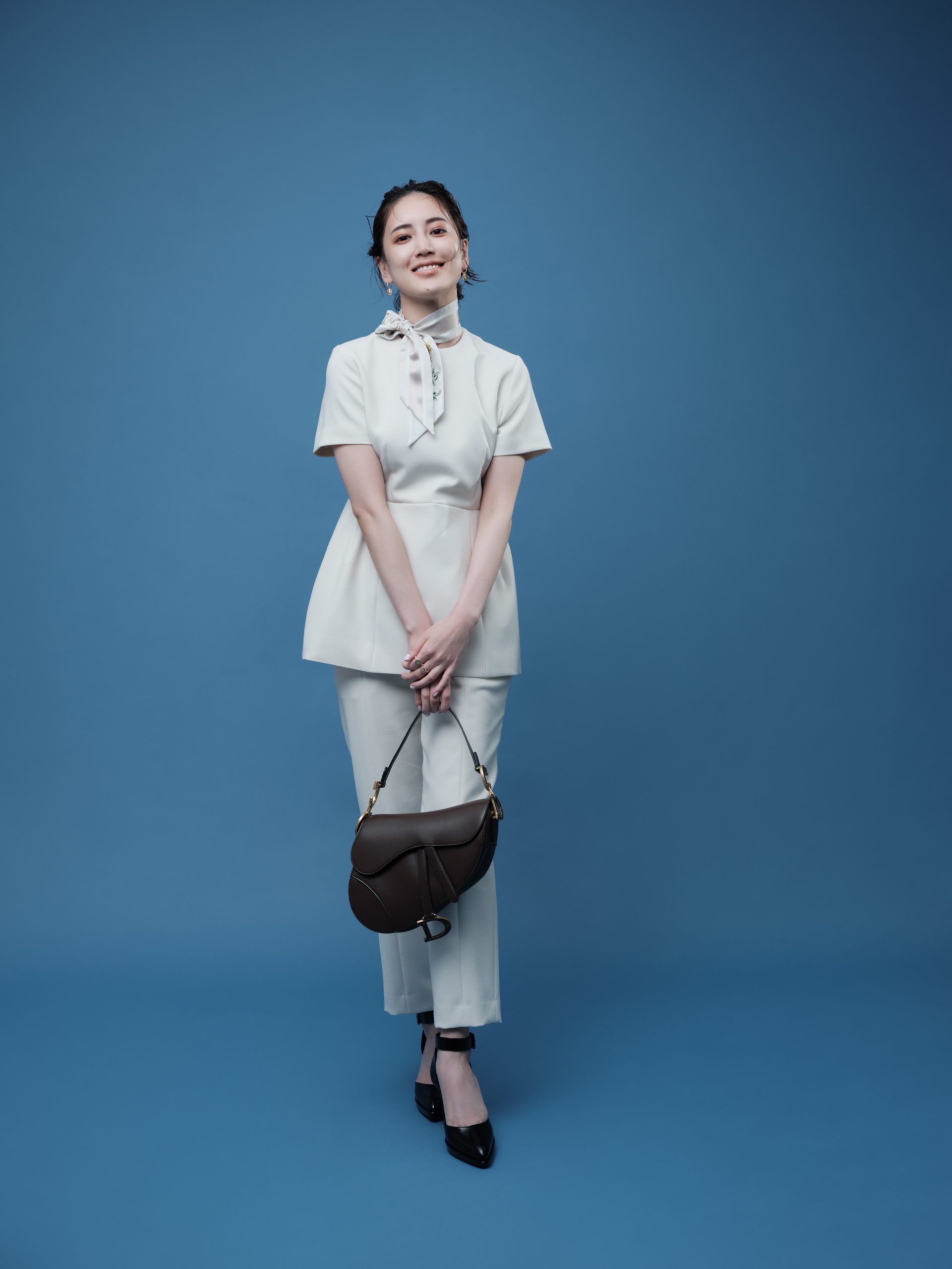 バッグ「サドル」〈H20×W25.5×D6.5㎝〉¥620,000スカーフ¥30,800靴「ディオール ソウル」〈H8㎝〉¥178,000〈すべてディオール〉「ローズ デ ヴァン」〈PG×ピンクオパール×D〉イヤリング¥640,000リング人差し指¥580,000中指¥425,000〈すべてディオール ファイン ジュエリー〉(すべてクリスチャン ディオール)プルオーバー¥26,400パンツ¥35,200(ともにエッフェ ビームス/ビームス ハウス 丸の内)