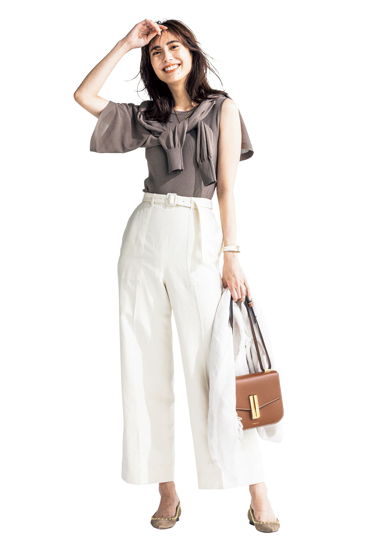 カーディガンは気になる二の腕をさりげなくカバーするのに有効。アンサンブルで取り入れるのもおすすめ。アンサンブルニット¥15,400(ルージュ・ヴィフ アンナ/ルージュ・ヴィフ ラクレ ルミネ新宿店)パンツ¥26,400(マルティニーク/マルティニーク ルミネ横浜)バッグ¥72,600(デメリエー/ルル・ウィルビー/アルアバイル)パンプス¥64,900(ペリーコ/アマン)ストール¥26,400(アソースメレ/アイネックス)ネックレス¥24,200(マリハ)時計¥31,900(リップ/エイチエムエスウォッチストア 表参道)