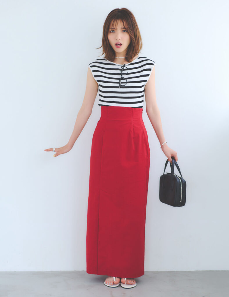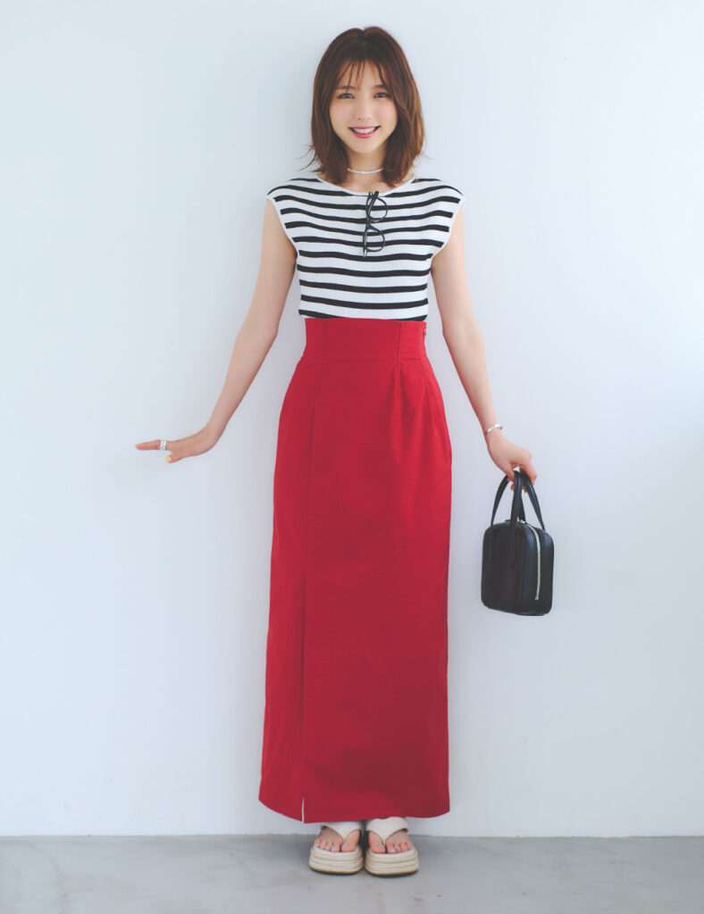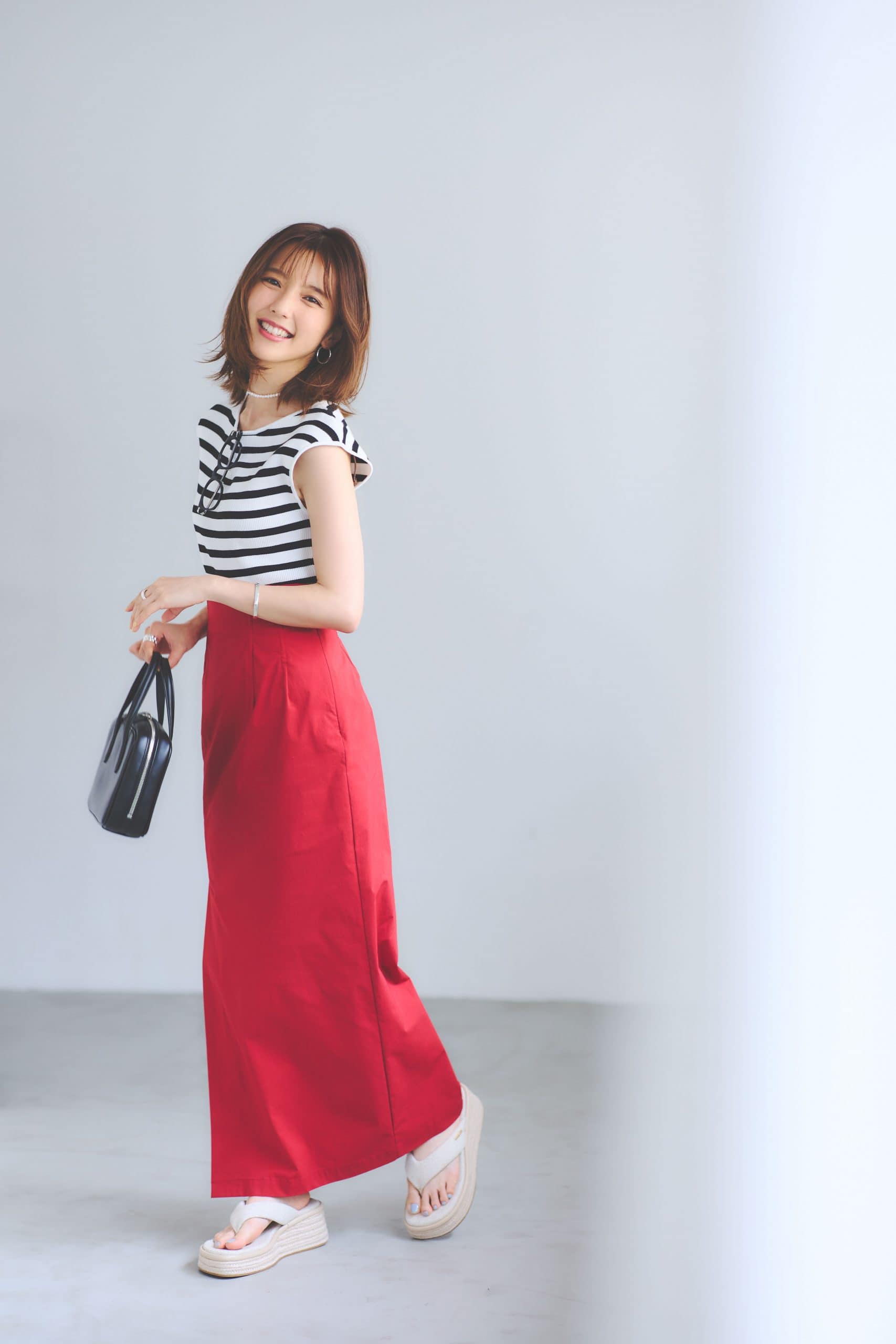 ゴツめの厚底靴が苦手なキレイめ派には、クリーンなベージュがおすすめ。ほどよい肌見せが叶うトングデザインで、軽やかな足元が実現します。今の季節によく合うジュート素材のソールは、夏のおでかけコーデにぴったり。ボーダーカットソー×パキッと映える赤スカートのコンビで、都会的なマリンコーデの完成です。