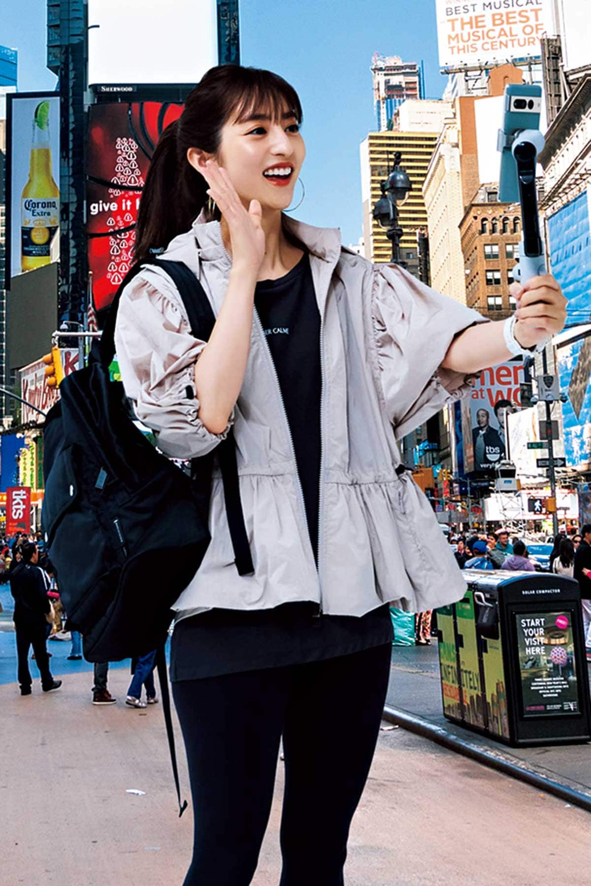 ブルゾン×ロゴトップス×レギンスで、ニューヨーカー風に変身!王道のタイムズスクエアからスタートしてハイラインやベッセルを歩く予定。インスタライブにも慣れてきたし、視聴者数も順調に増えてる♡1カ月前と比べて、かなり成長したかも、私。