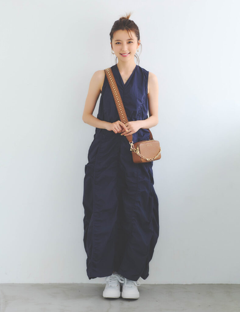 涼しげな配色が今の気分にぴったりの、ネイビーワンピ×白スニーカーコーデ。ボリューミィなソールでも、オールホワイトのシンプルなデザインなら、主張しすぎない着こなしが可能です。クリーンな白スニーカーは上手にバランスを取りやすく、どんなコーデにも自然にマッチ。シンプルなワンピースのほどよいアクセントとして活躍してくれます。