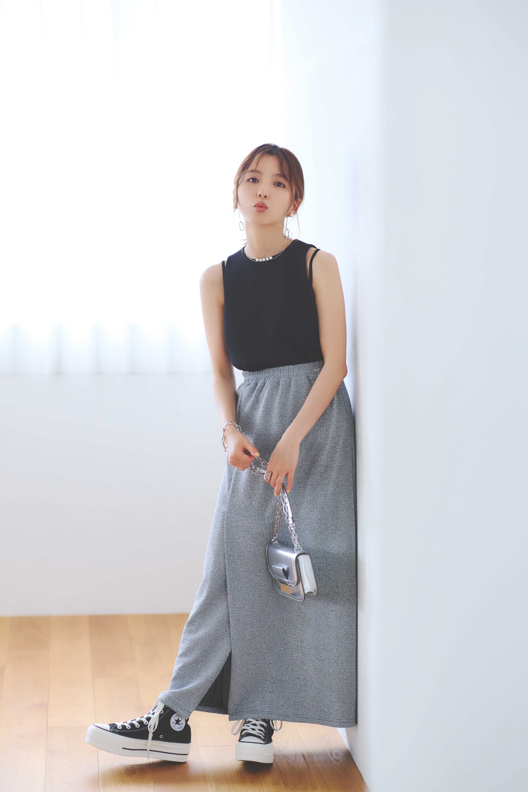 履き慣れた「オールスター」を、厚底仕様の新作でアップデート!モノトーンなら、ボリュームソールでもシックな印象です。微細なラメが華やかなスリット入りスカートで変化をつけて、“notカジュアル”なよそ行きコーデに。