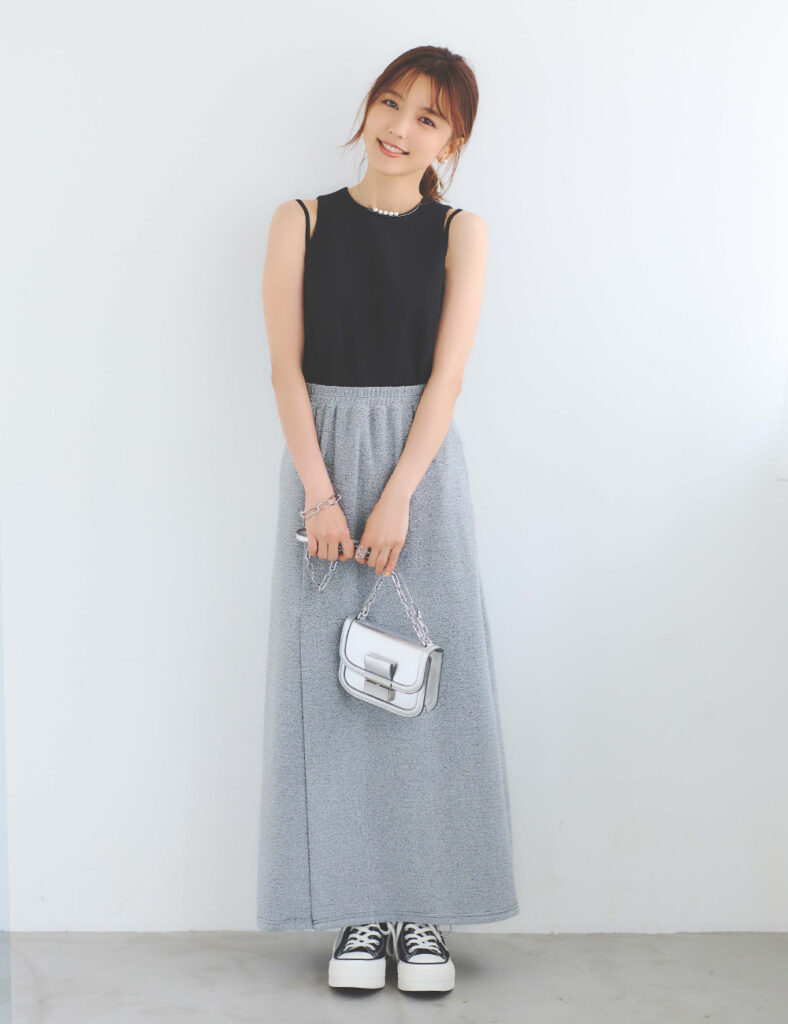 オールスターを次世代的にアレンジしたモデル「オールスターアール」に、新作の「リフテッド」が登場。高さ5cmの厚底ソールはウレタンフォームを内蔵し、クッション性に優れ、軽やかな足取りを実現します。ボリュームスニーカー「リフテッド HI」<ソール=5cm>※8月発売予定¥10,450(コンバース/コンバースインフォメーションセンタ-)アメスリストラップデザイントップス¥8,910(Mila Owen)スリット入りラメスカート¥9,900(AKTE)バッグ¥12,500(CHARLES & KEITH/CHARLES & KEITH JAPAN)パール付きチョーカー¥19,800ピアス¥18,700チェーンブレス¥20,900リング¥16,500(すべてADER.bijoux/アデルビジュー ショールーム)