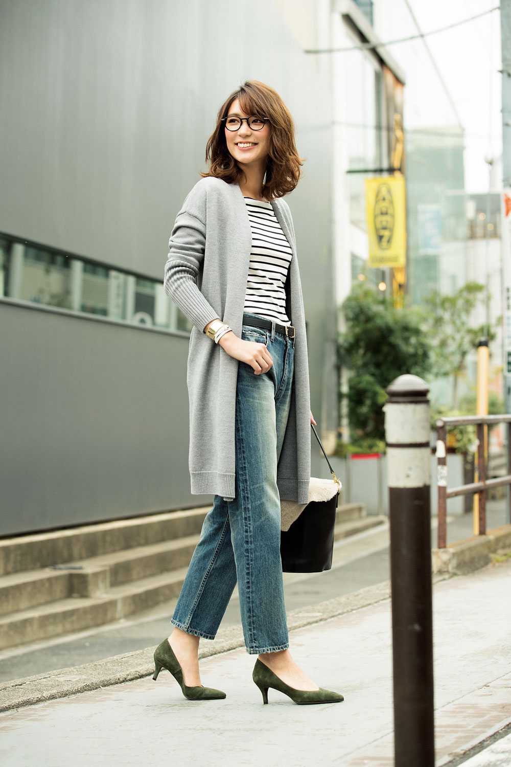 足元はパンプス。背が高いからといってヒールをサボるのは厳禁です。ストレートデニムとの相性がよく、程よい抜け感も出せるんです。