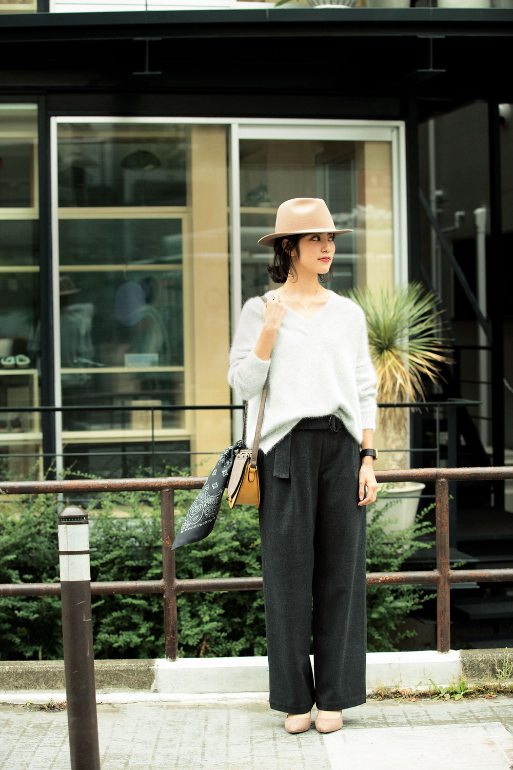 ニット¥13,000(TONAL) ワイドパンツ¥8,800〈The 1st Floor〉バッグ¥7,500〈ナノ・ユニバース〉(ともにナノ・ユニバース カスタマーサービス) スカーフ¥2,300(ディ スティル/ザ・スーツカンパニー 銀座本店) ハット¥4,900(Angouleme) パンプス¥12,000(DRWCYS) ネックレス¥2,080ブレスレット¥8,000(ともにJUICY ROCK)