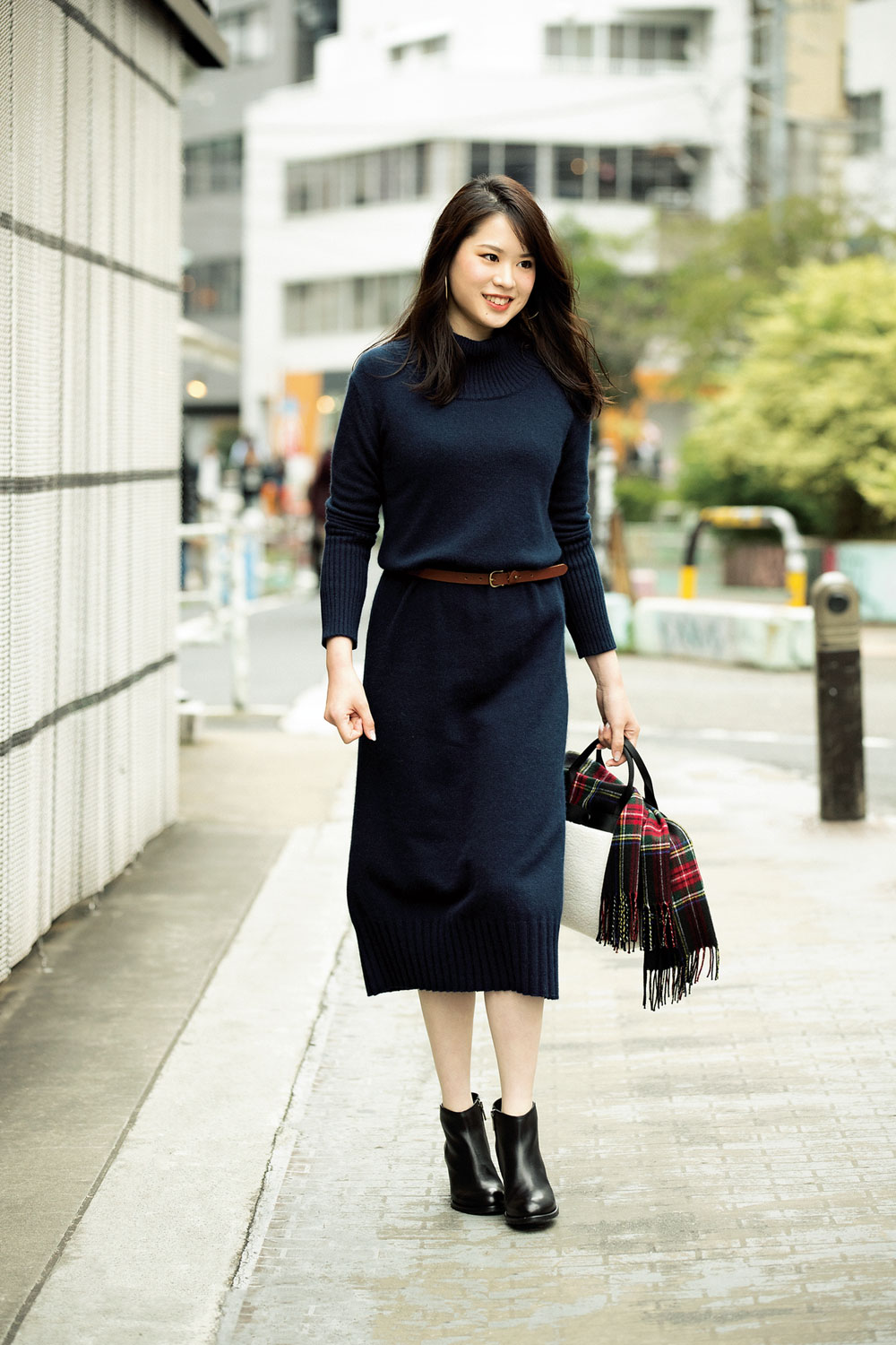 ワンピース¥24,000ベルト¥6,800(ともにDRWCYS) ストール¥4,900(CLEAR IMPRESSION) バッグ¥3,900(Angouleme) ショートブーツ¥31,000(ファビオ ルスコーニ/エッセイ ルミネ大宮店) イヤリング¥1,500(アネモネ/サンポークリエイト)