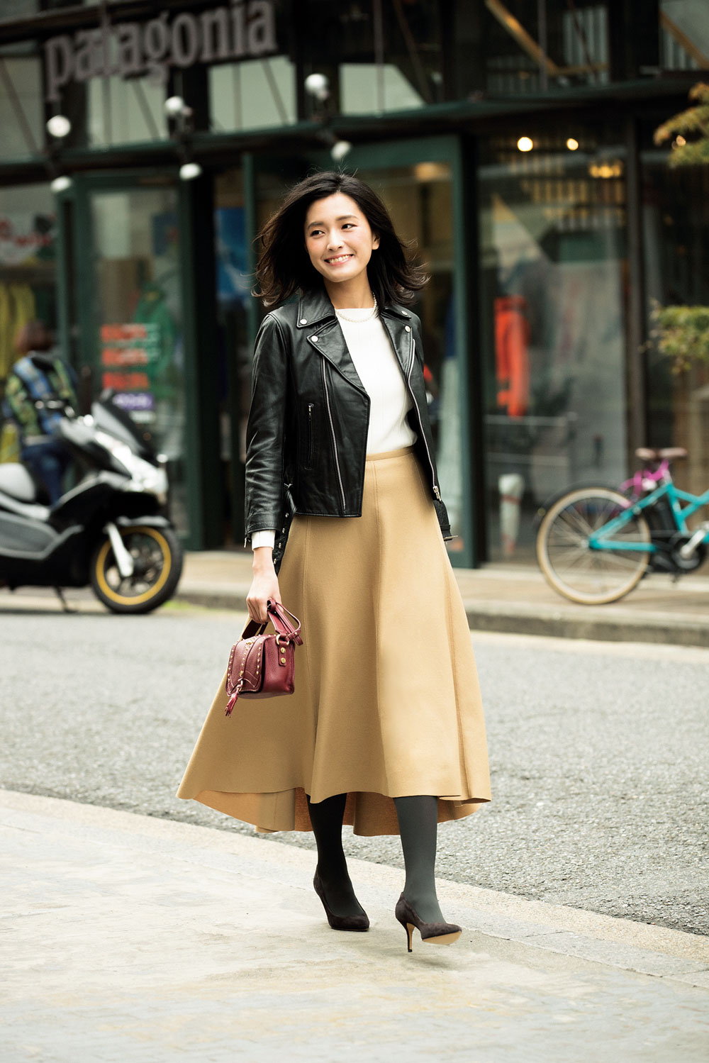 スカート¥16,000(I.T.’S.international) ジャケット¥49,000(モナーム/カイタックインターナショナル) ニット¥9,000(TONAL) バッグ¥27,000(ナルー/ル タロン プリュ 京都河原町店) パンプス¥22,000(コルソ ローマ ノーヴェ/ル タロン 表参道店) タイツ¥1,300(タビオ/タビオ) ネックレス¥4,600(アネモネ/サンポークリエイト)