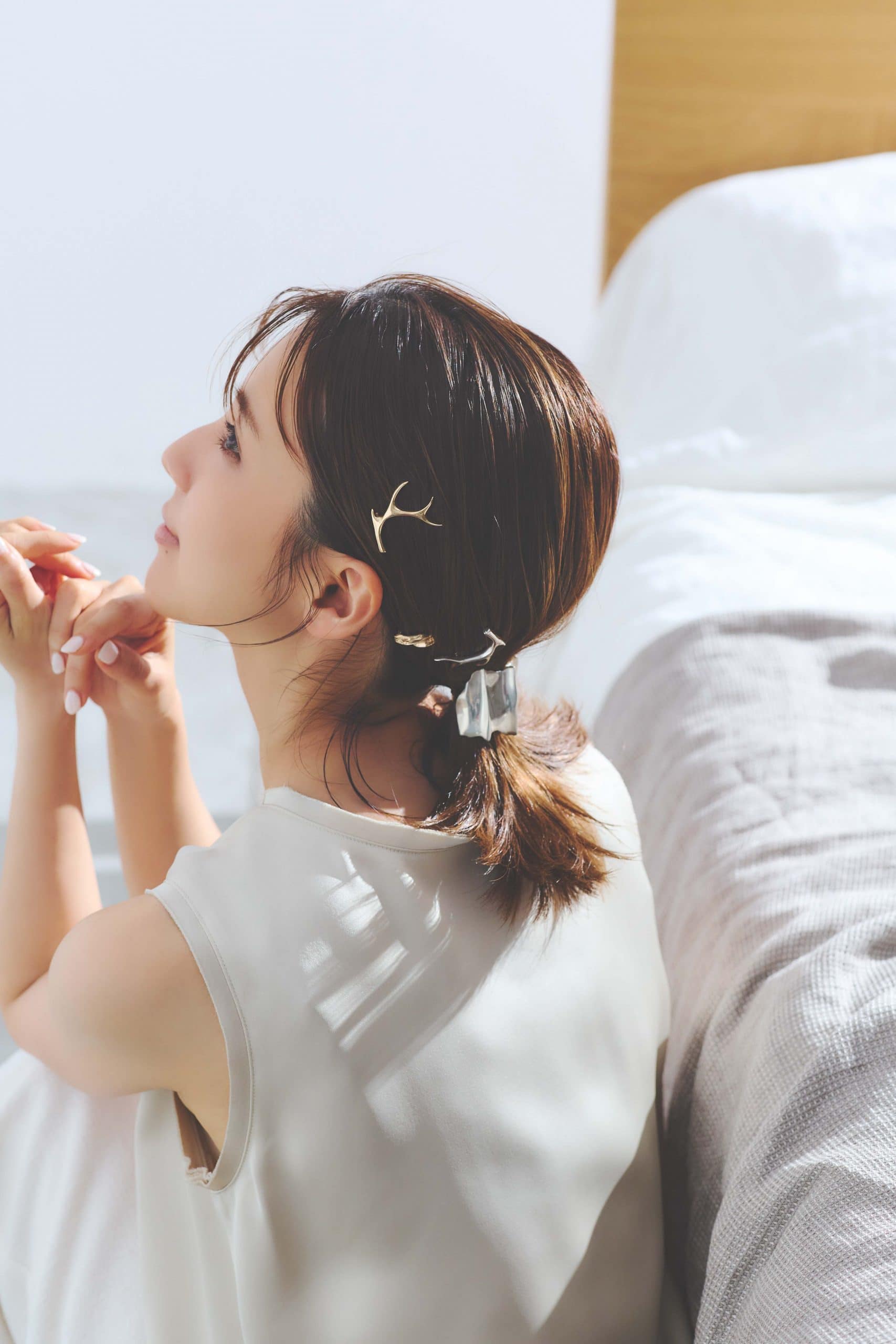 独特なシルエットのデザインが、業界内でも常に話題のアクセブランド「プリュイ」。ポニーテールの結び目に刺した大ぶりなヘアピアスは、波打つ表情がアクセントに。ころんとしたシャンパンカラーのヘアピアスや、鹿の角モチーフのクリップは、ほどよい華奢さでバランスが取りやすく、ランダムに重ねづけしてもサマになります。