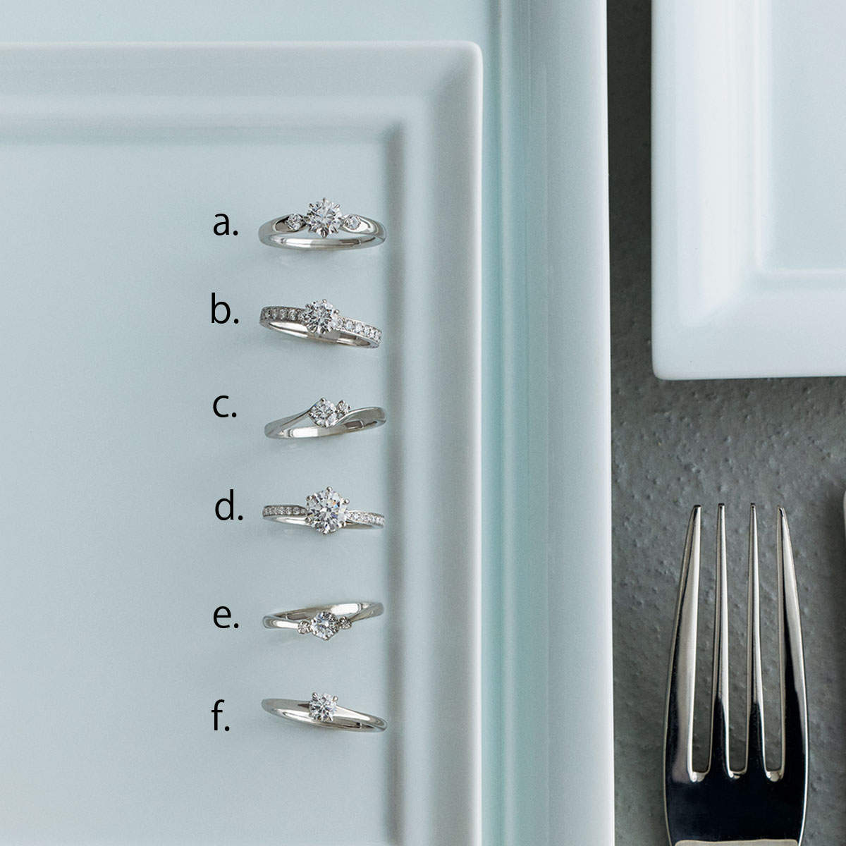a.ふたりの輝やかしい未来を象徴する太陽をイメージ。リング〈Pt×Dセンター0.2ct~〉¥303,600~(スタージュエリー/スタージュエリー銀座店)b.アームにもダイヤモンドとミルグレインを散りばめ、センターストーンをより華やかに。ダイヤモンドリング〈Pt×Dセンター0.2cut~〉¥572,000~(アベリ)c.いつもふたりの間に新鮮な風が流れているように。そんな風をイメージさせる、優美なアーム。リング〈Pt×D〉¥286,000~(ポンテヴェキオ/ポンテヴェキオ ブライダル 銀座並木通り本店)d.石座のエッジやアームをすっきりとさせることで、凛とした表情に。リング〈Pt×D〉¥341,000~(アーカー ブライダル/アーカー 表参道ヒルズ店)e.繊細なVラインに、サイドの石はハートというキュートなこだわりが。リング〈Pt×D〉¥151,250(サマンサ ティアラ/サマンサティアラ 新宿タカシマヤ店)f.クラシックを極めた、上品なフォルム。リング〈Pt×D〉¥396,000~(デビアス フォーエバーマーク)