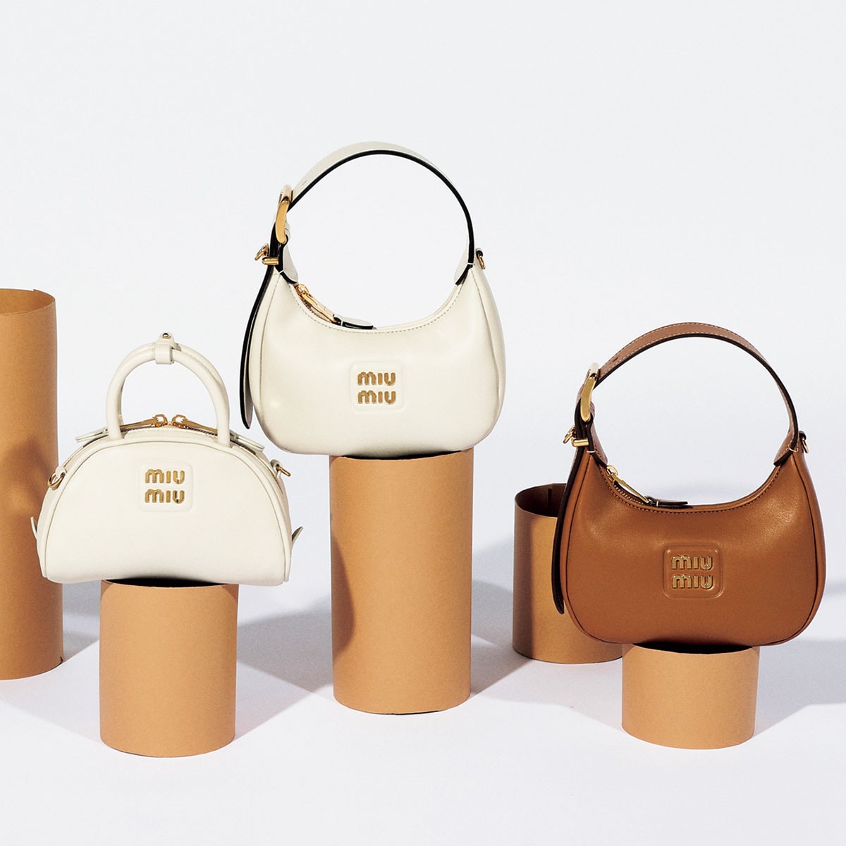 [右から]バックルを調整すれば、ハンドルの長さの変更も可能。小わきに収まる小さめサイズのホーボーバッグはこの秋冬の注目デザインのひとつ。バッグ〈H15.5×W17×D5.5㎝〉各¥242,000上品な佇まいのミニミニボストン。サイドに大きく開くファスナーのおかげで、アイテム収納もノーストレス。付属のショルダーストラップを取り付ければよりカジュアルな印象に。バッグ〈H11.5×W18×D8㎝〉[ストラップ付き]¥247,500(すべてミュウミュウ/ミュウミュウ クライアントサービス)