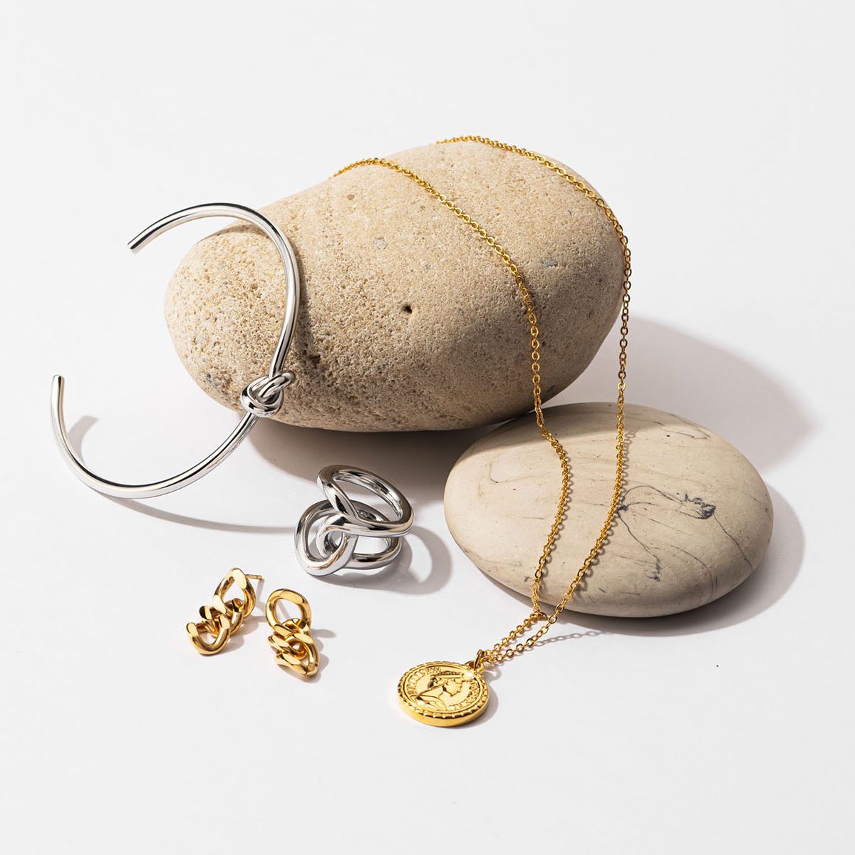 バリエーション豊富で、気になるデザインに目移り必至です。[左から]重ねづけしても映えるワンポイントデザイン。バングル〈316L〉¥3,000流行りのチェーンモチーフ。ピアス〈316L〉¥3,000これ一つするだけで手元が華やかに!リング〈316L〉¥2,800リバーシブルで使えるペンダントトップが便利。ネックレス〈316L〉¥2,800(すべてCENE)