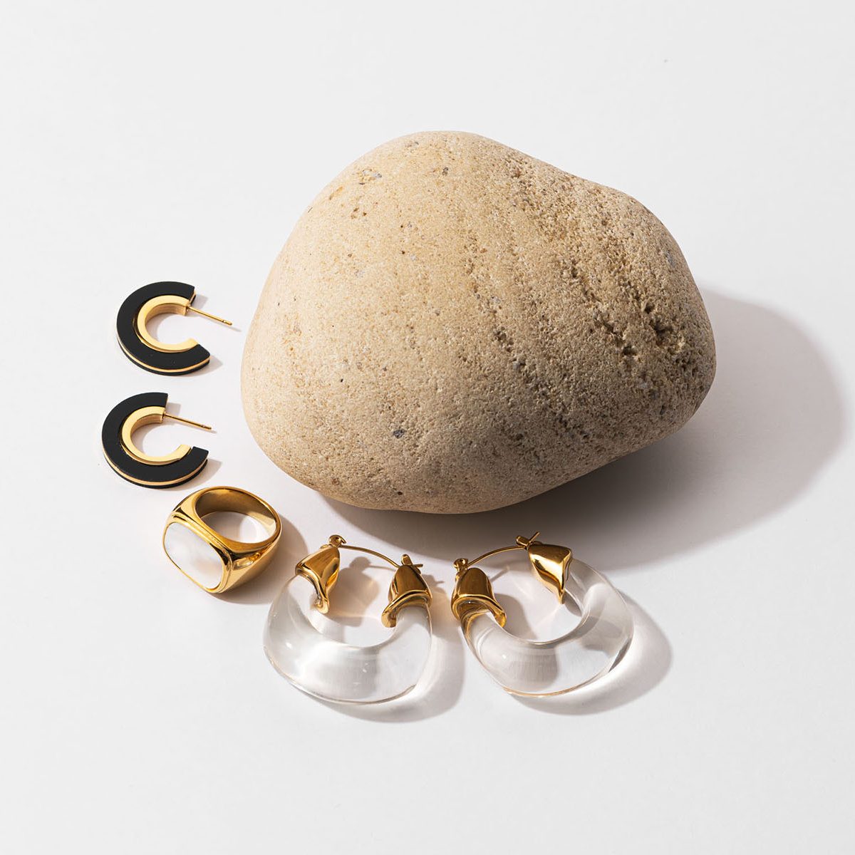 [左から]ブラックのパーツが大人な表情に仕上げる。ピアス〈316L〉¥3,000マザーオブパールが上品な手元を演出。vfリング〈316L〉¥3,000透明なアクリルがとても涼しげ。ピアス〈316L〉¥2,800(すべてCENE)