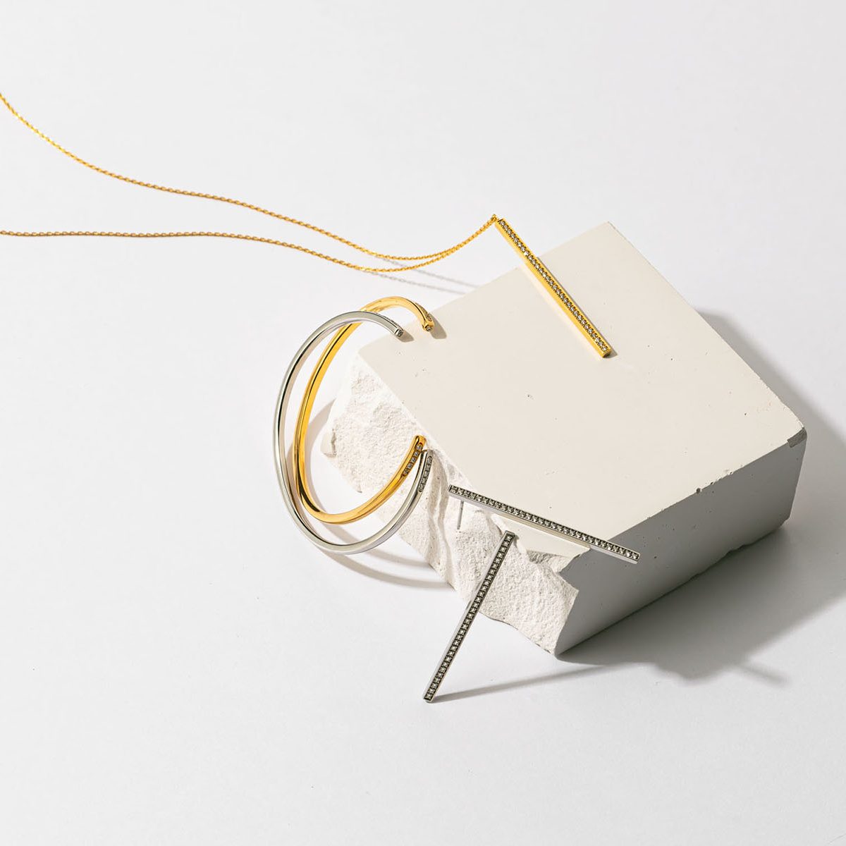 ブランドの原点であるメレダイヤを流れるように配列したデザイン。[上から]シンプルなTシャツに合わせたいロングネックレス。ネックレス〈316L×24kGP×D0.18ct〉¥38,500単品で使うのもオシャレですが、重ねづけするとリッチに仕上がるシルバーとゴールドのバングル。シルバーバングル〈316L×D0.07ct〉¥30,800ゴールドバングル〈316L×24kGP×D0.07ct〉¥30,800顔の印象をすっきりと見せてくれるIラインのピアス。ピアス〈316L×D0.18ct×2〉¥70,400(すべてMELEMELE)
