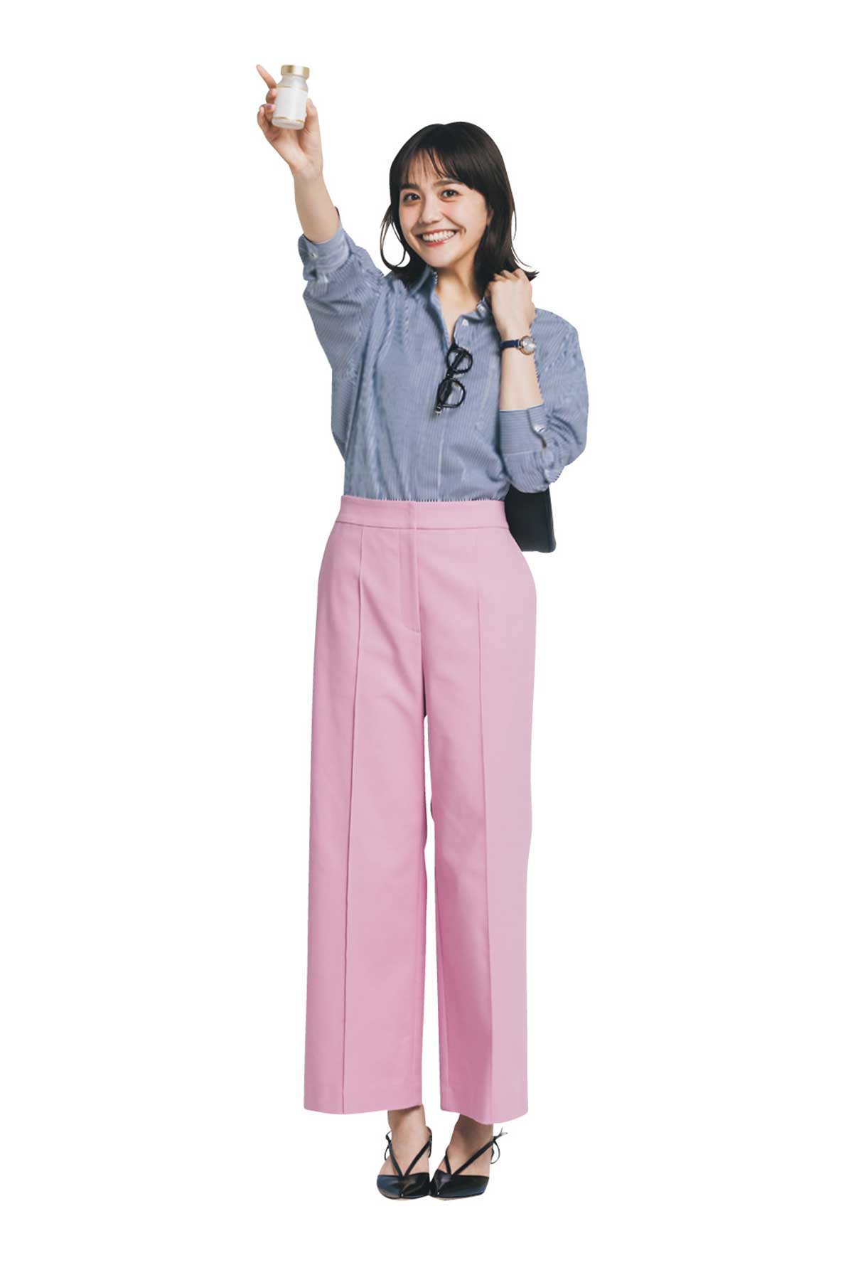 気持ちがシャキッとする安定と信頼のシャツを着て、サプリで脳を覚醒して…さぁ、今週も始まった!バイブス的には多忙だけど無敵な笑顔の、朝ドラ女優になれる感じ。みんな、ついて来れてる?大丈夫そ?バッグ¥74,800(ロンシャン/ロンシャン・ジャパン)サンダル¥59,400(ネブローニ/フラッパーズ)メガネ¥16,600(ゾフ/ゾフ カスタマーサポート)イヤリング¥5,500(アビステ)時計¥22,000(シーン/カシオ計算機 お客様相談室)