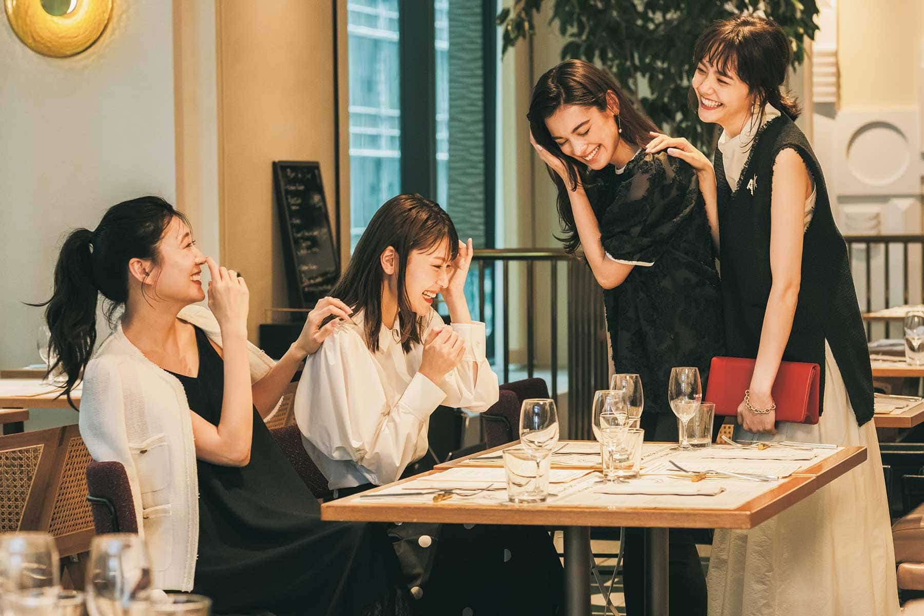 毎回ドレスコードを決めて、オシャレ心も満たすのが私たちのポリシー。今日のモノトーンコーデも、みんなそれぞれ着こなしに個性が出てる!男性と会う日と違って女子会なら、自分が好きなオシャレも、金額を気にせず食事も楽しめてサイコー!「ねぇ、聞いて〜!この前デートした人がさ…」と、ナミが早速。待って、とりあえず注文しよ(笑)。