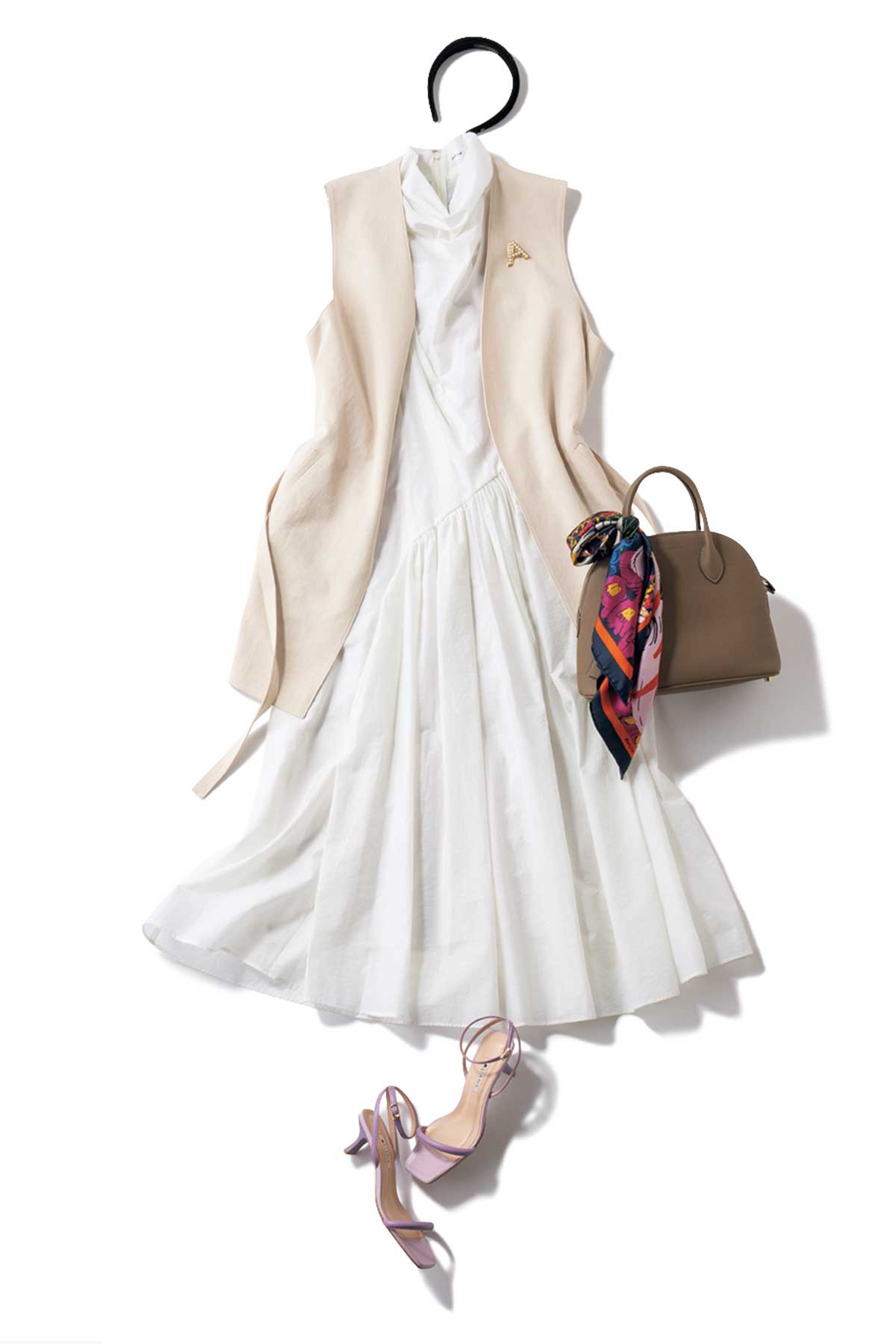 清潔感とモードな洒落っ気を兼ね備えた、白のハイネック型。ワンピース¥29,700(FRAY I.D)