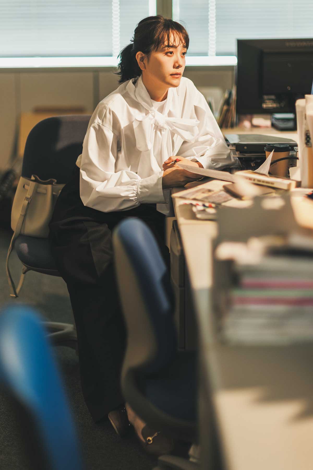 ボウタイを取り外せるだけでなく、前後両面で着られるマルチway。ブラウス¥37,400(ANAYI) -