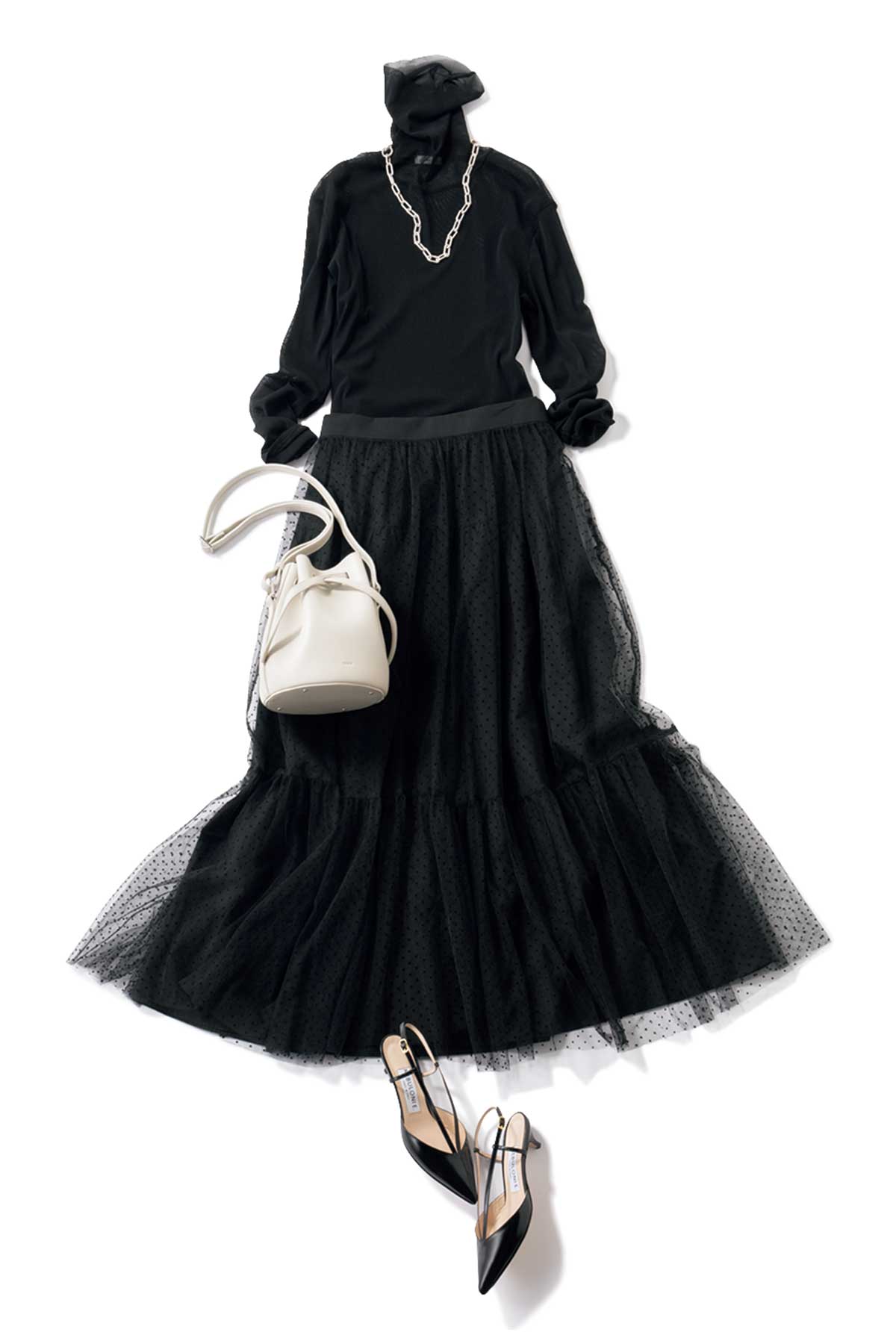 黒コーデって強い女に見られそうで出会いの場では避けていたけど、チュールのふわっと感でレディにも振れる!ハードスケジュールの限界アラサーは、移動中もアプリで相手探し。長年の経験で、プロフ文面だけでモラハラの香りを嗅ぎ分けられるようになった!気がする。バッグ¥39,600(VASIC/ヴァジックジャパン)サンダル¥59,400(ネブローニ/フラッパーズ)ネックレス¥10,450(イン ムード/フォーティーン ショールーム)